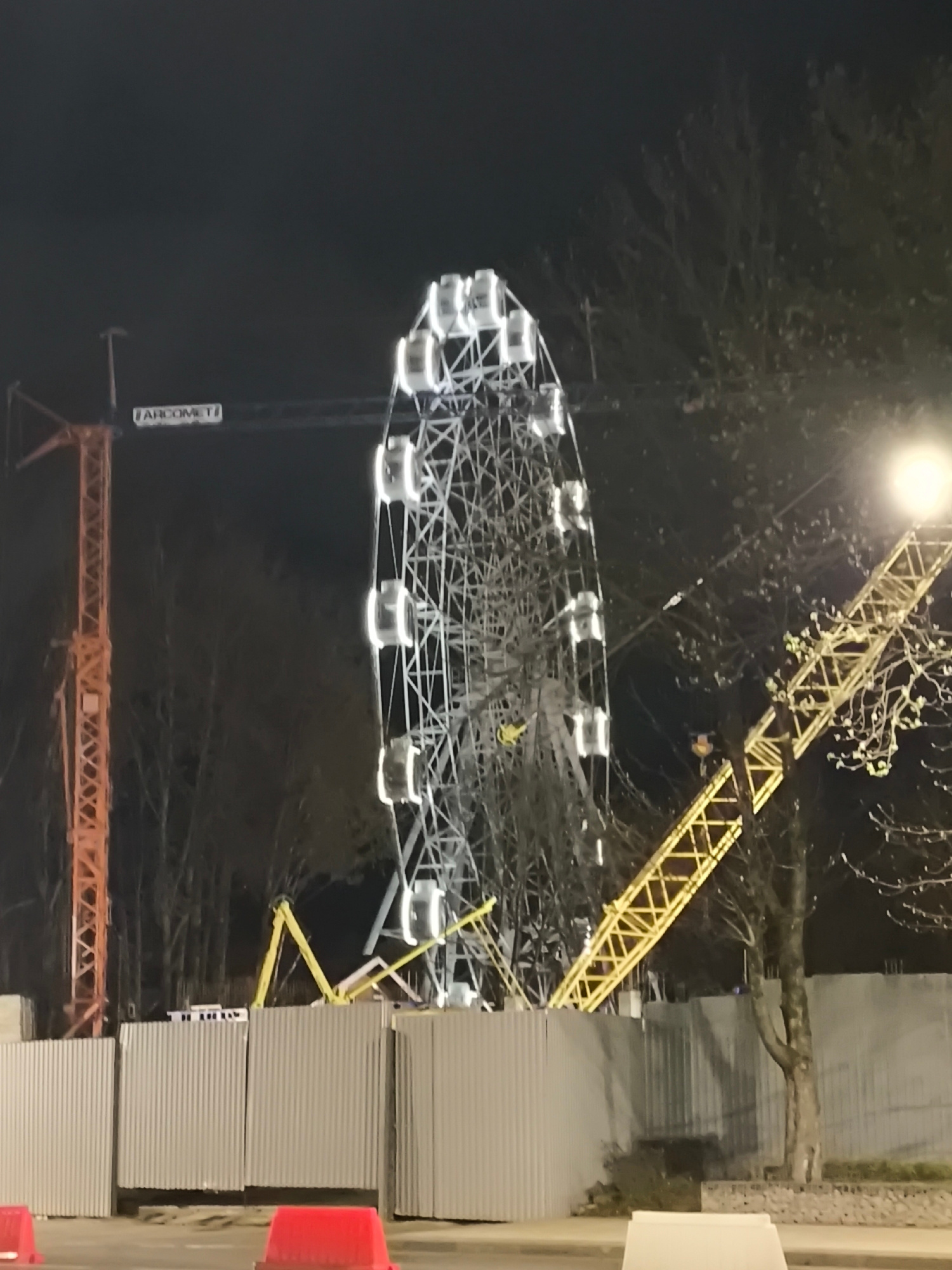 Observed at night, the image reveals a Ferris wheel illuminated with lights in Smolensk, Russia. Two cranes flank the Ferris wheel, one painted orange and the other yellow. A gray metal fence runs alo…read more