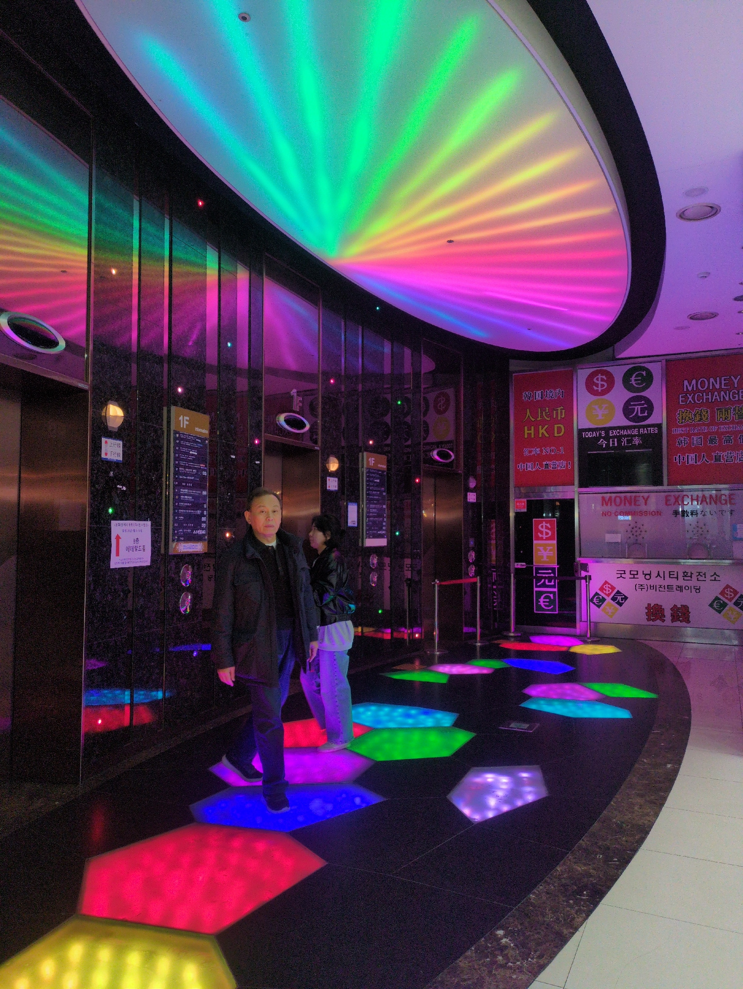 Here is a description of the image: The image shows an interior space, likely a lobby or corridor, with notable features indicating a commercial establishment in Seoul, South Korea. Two individuals a…read more