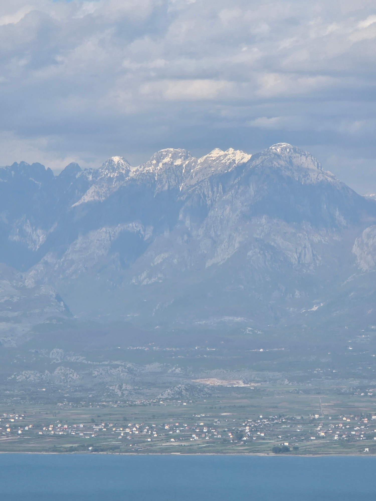 The image shows a landscape with a large mountain range in the background. The peaks are partially covered with snow. In the foreground, there is a coastal plain with vegetation and a settlement consi…read more