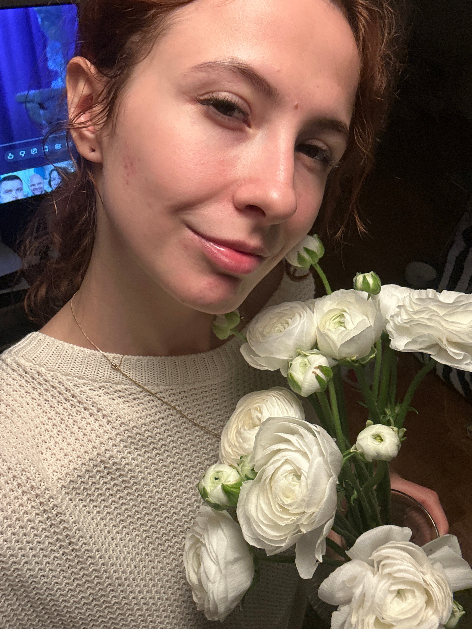 A young woman with reddish-brown hair is lying down, wearing a light beige knitted sweater and a delicate gold necklace. She is partially illuminated, with the light casting shadows on her face. She i…read more