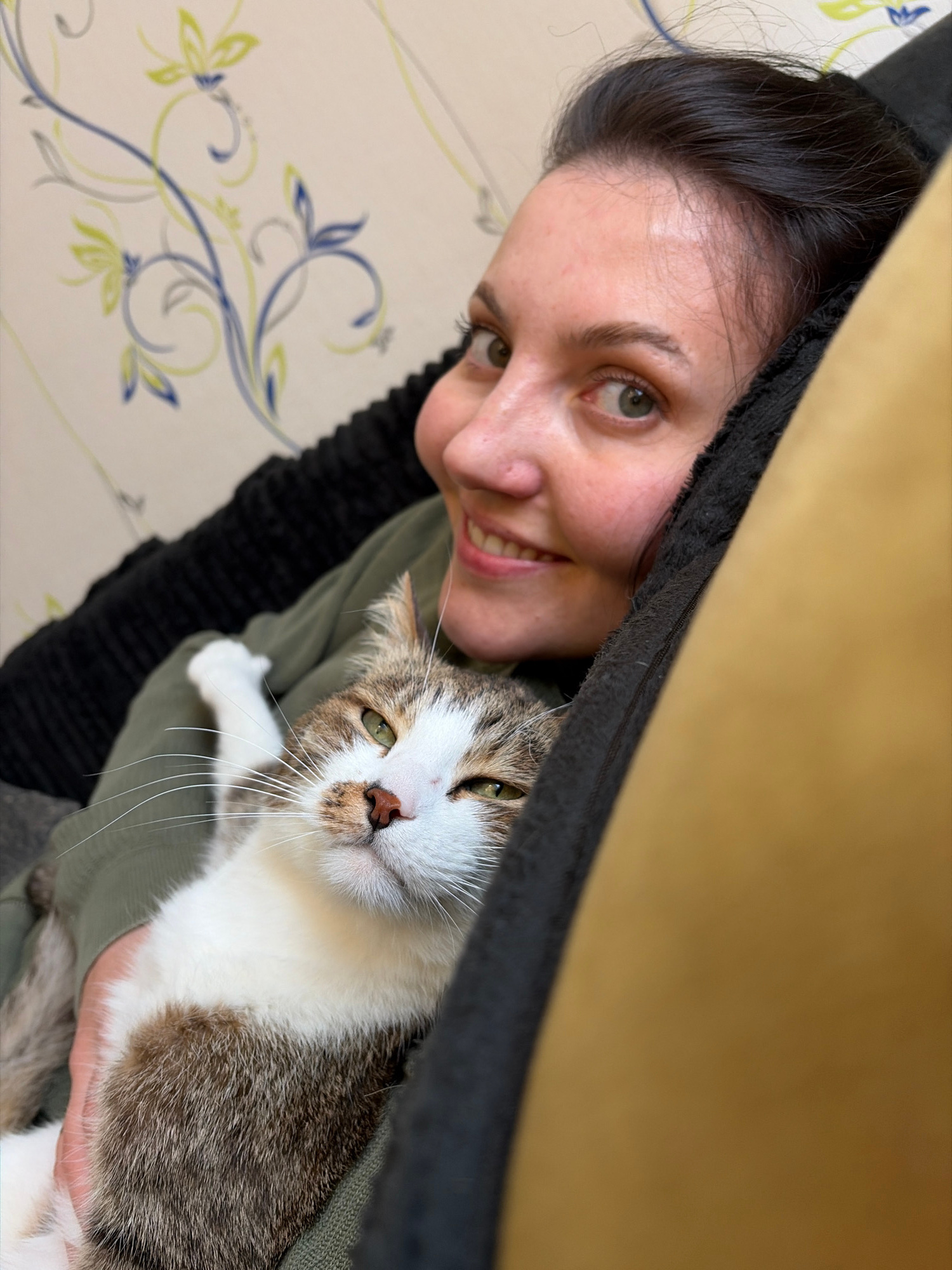 A woman with dark hair and green eyes is holding a tabby cat with white fur in her arms. The woman is smiling and looking at the camera. The cat is looking to the left of the camera with a neutral exp…read more