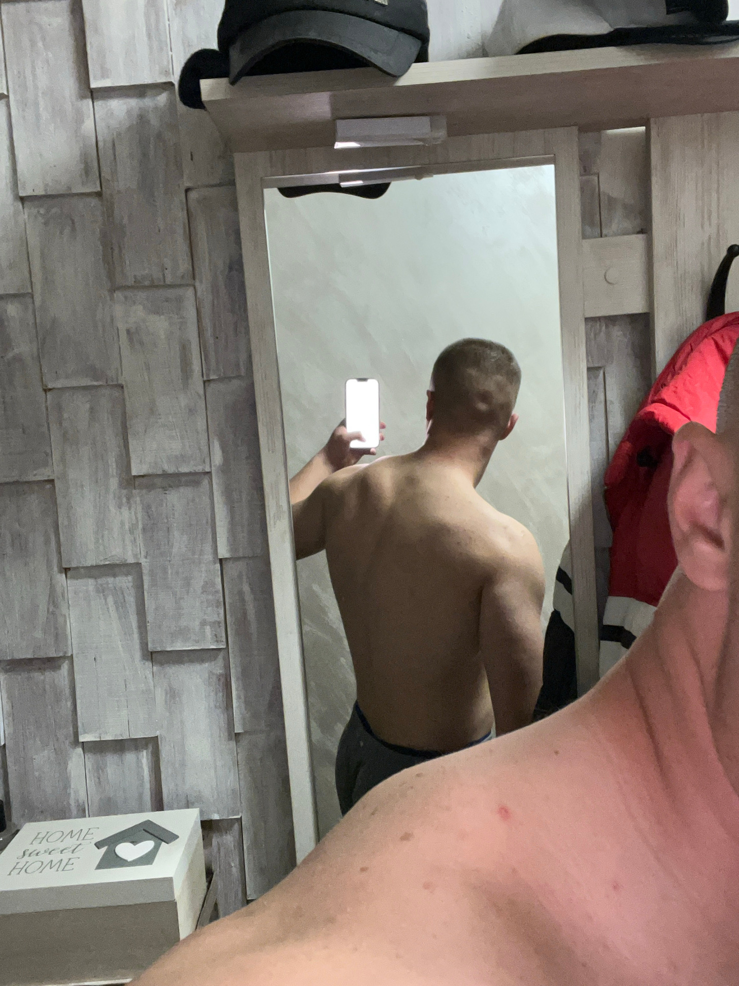 A mirrored reflection shows a shirtless man holding a smartphone. The background features a faux-brick wall, a mirror frame, and miscellaneous items. "HOME SWEET HOME" is visible on a small decorative…read more
