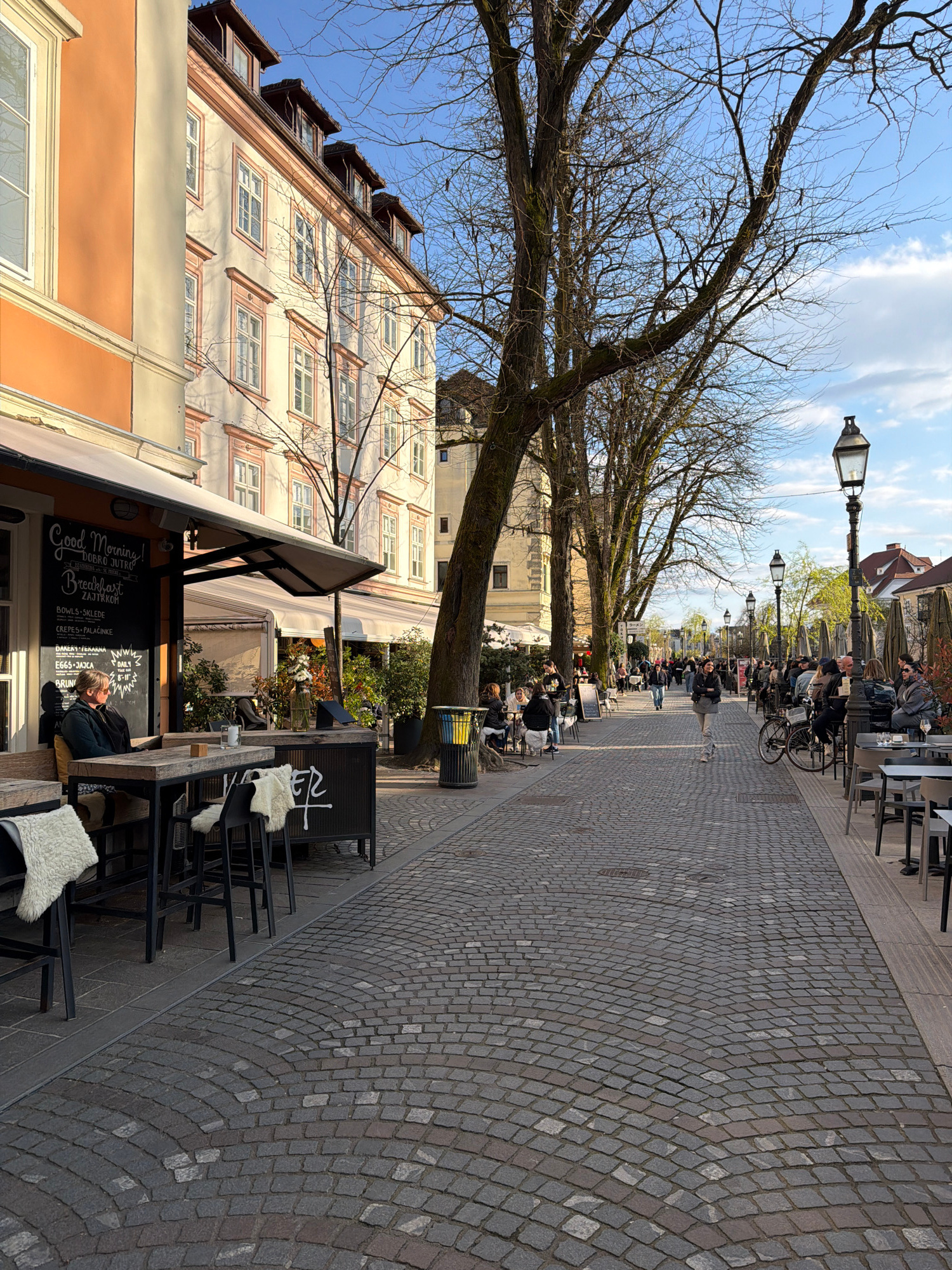 The image shows a street scene in Ljubljana, Slovenia, likely along the Ljubljanica river. The perspective is looking down a cobbled street lined with trees and lampposts. On either side of the street…read more