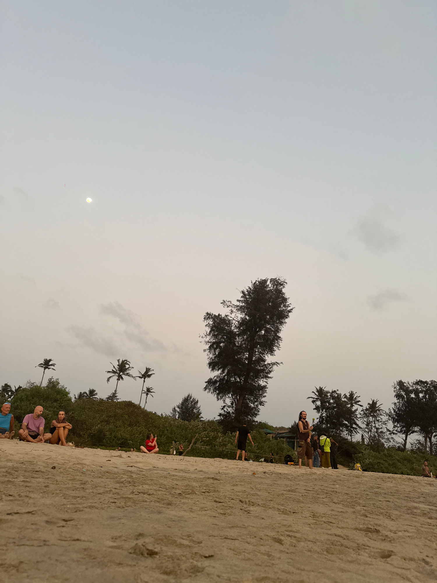 The image captures a scene at Arambol, India, likely a beach environment. The horizon is tilted, with the sky taking up the majority of the frame. The sky is overcast with muted grey tones, with a sma…read more