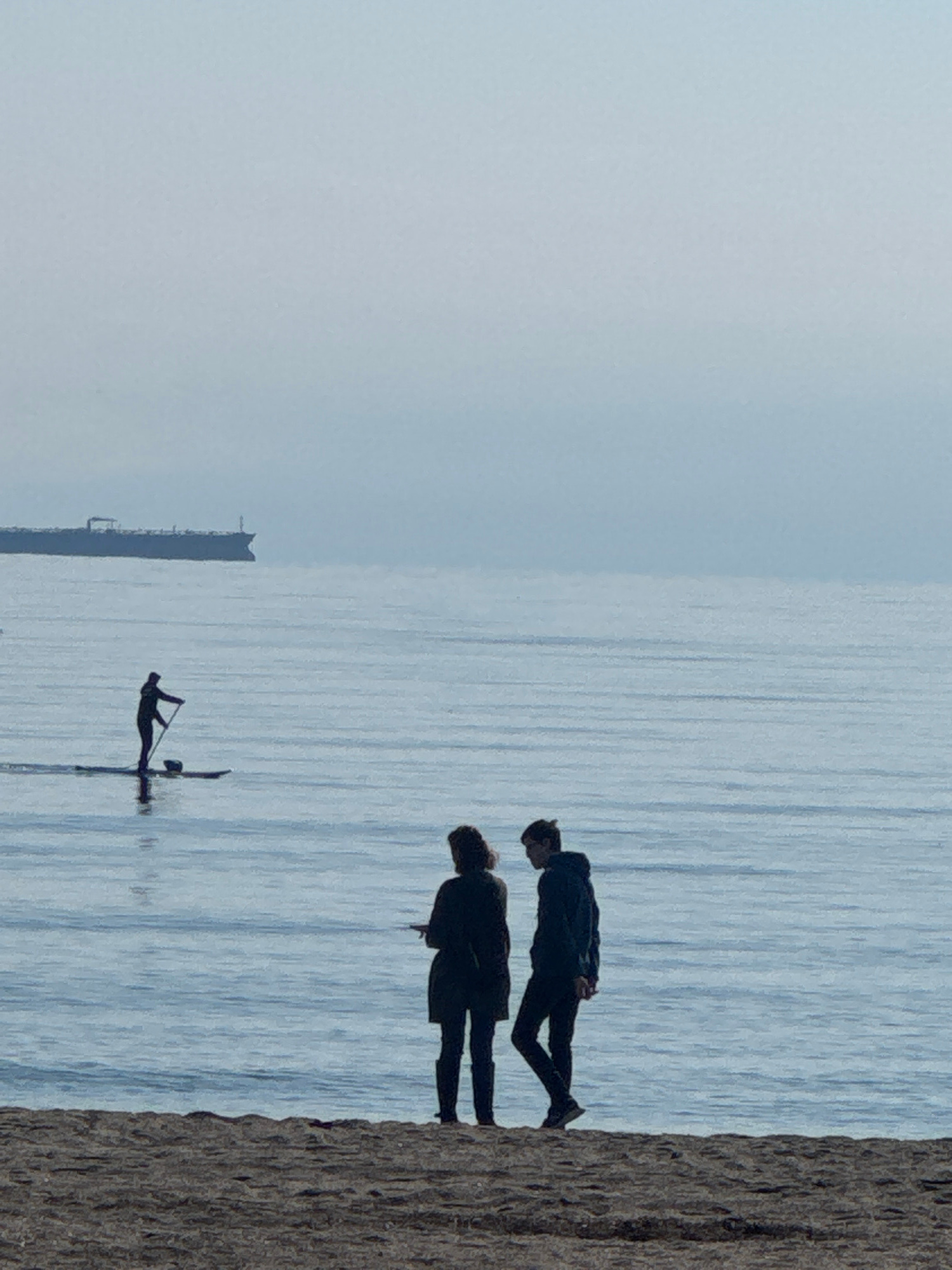 The image shows a scene at Burgas beach, Bulgaria. Two people are standing on a concrete pier or breakwater on the right side of the frame. They are both wearing dark clothing and appear to be looking…read more