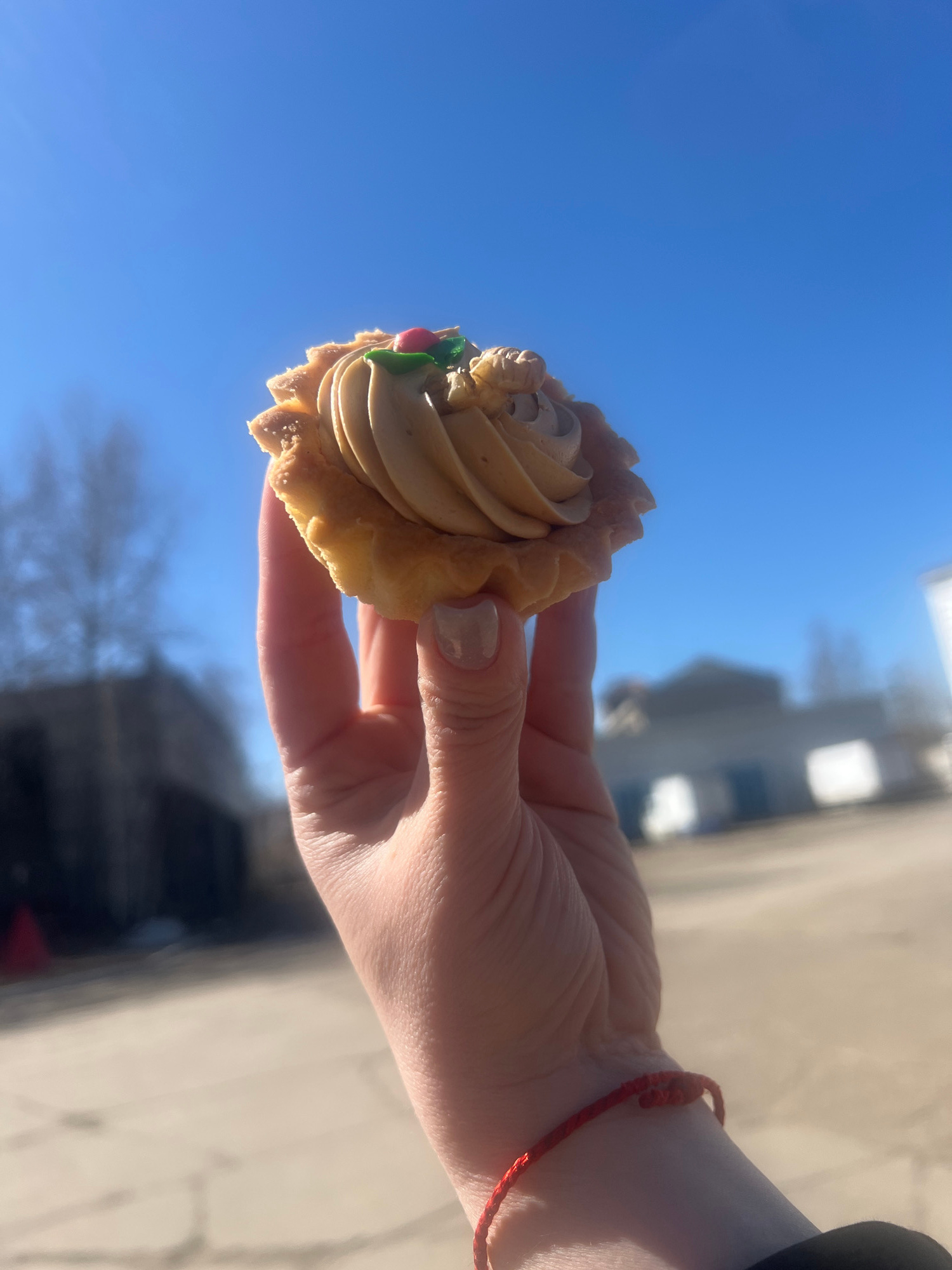 A photograph shows a hand holding a small tartlet-like pastry against a clear blue sky. The pastry consists of a golden-brown, crimped crust filled with light-brown piped frosting and a small red and…read more