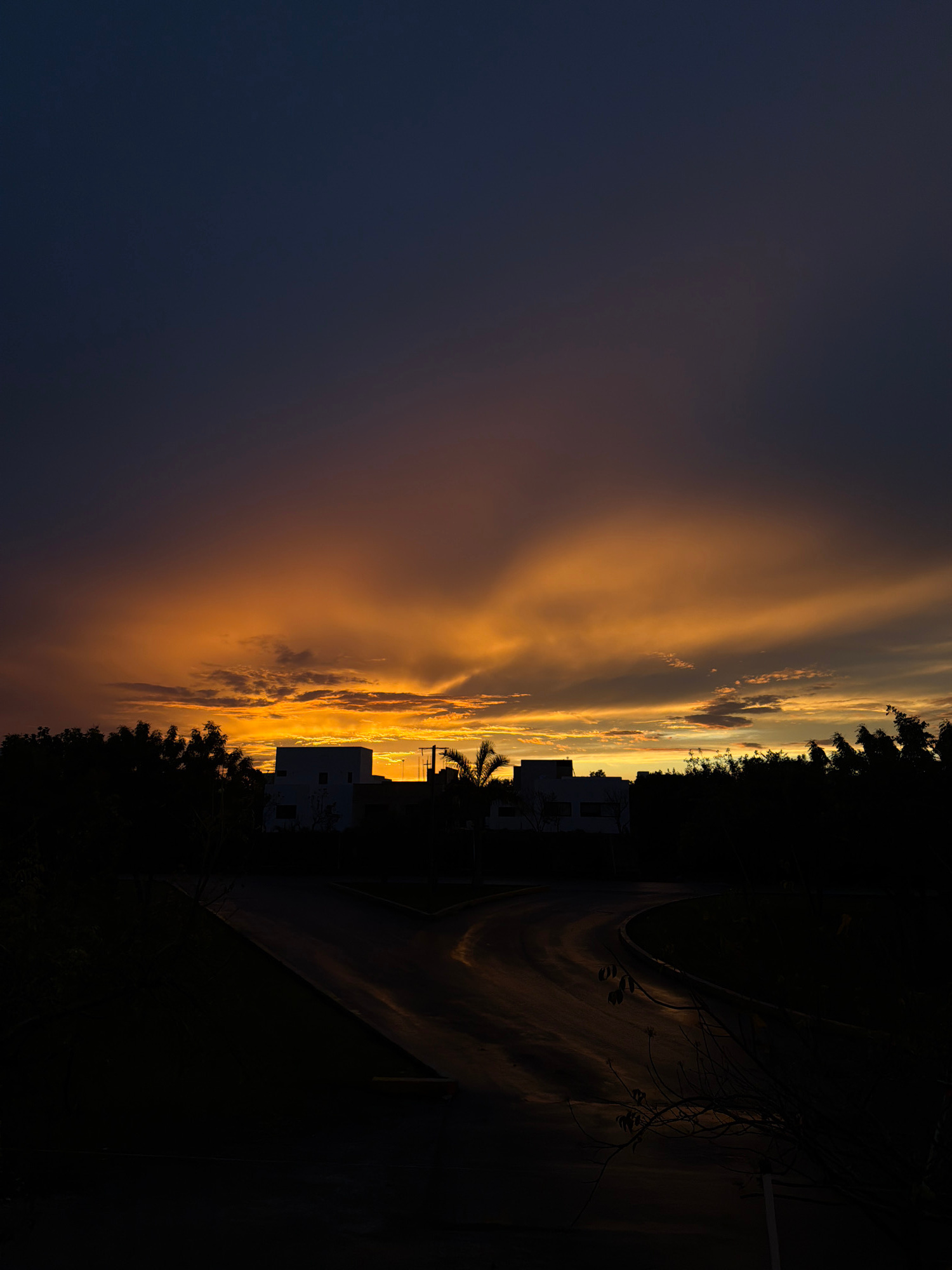 The image depicts a view at sunset. Silhouetted buildings and trees are visible against a sky with orange and yellow clouds. A dimly lit road runs alongside the buildings. The left side of the image s…read more