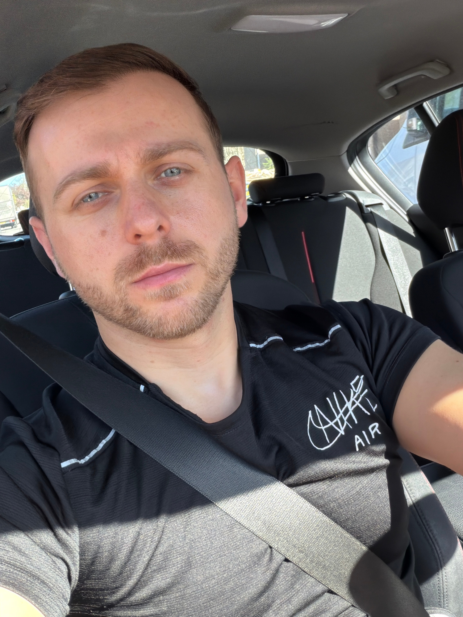 A fair-skinned male with short brown hair and a beard is sitting in a car, wearing a black shirt with a white logo. He is wearing a seatbelt. The interior of the car is gray and black. The location is…read more