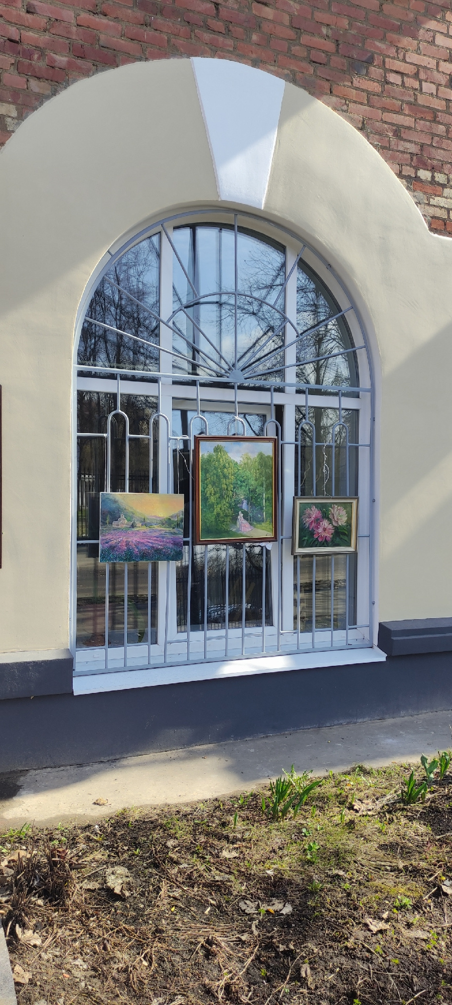 The image shows a partially visible rounded window of a building in Fryazino, Russia. The window is covered with a decorative metal grid. Three paintings are hung on the grid: one with flowers at the…read more