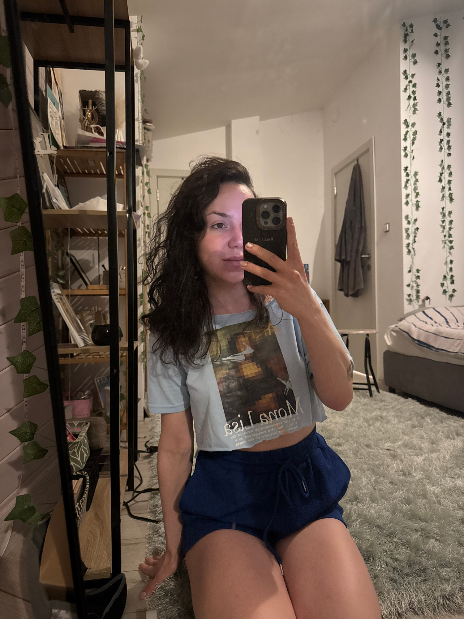 The image shows a woman taking a selfie in a room. She is wearing a light blue t-shirt and dark blue shorts. She is holding her phone with her left hand. The background includes a bed, a rug, a shelviβ¦read more