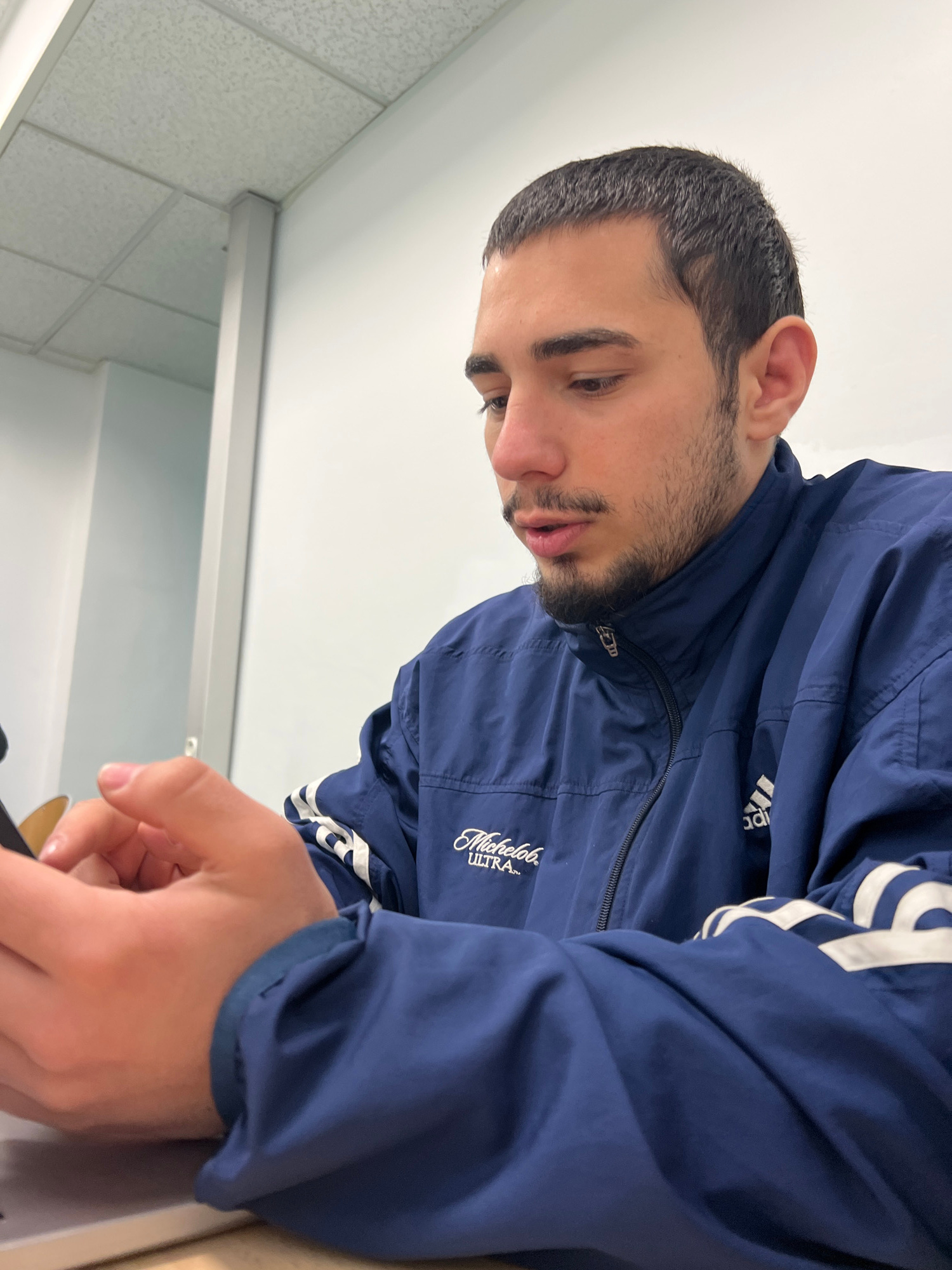 A man with short dark hair and a beard is indoors, wearing a blue Michelob Ultra jacket with white stripes on the sleeves. He is looking down, focusing on something in his hands. The background includ…read more
