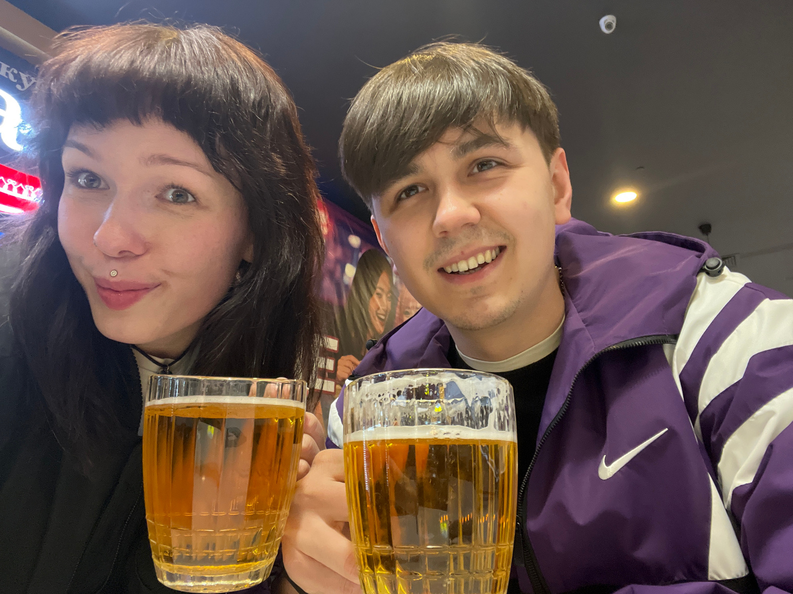 Two people are holding glasses of beer, likely indoors. A man wears a purple Nike jacket. The woman has dark hair and a piercing above her lip. The background includes signage in Russian, possibly ind…read more
