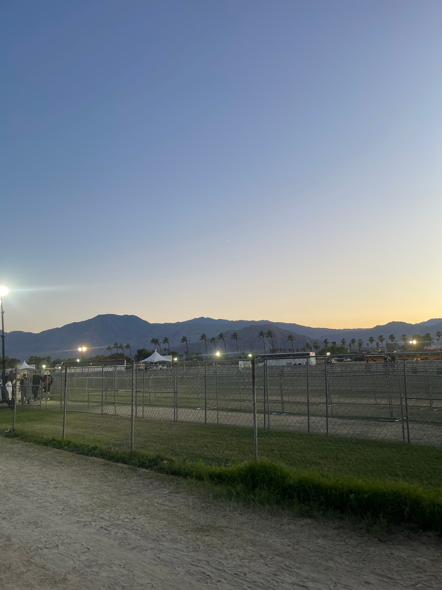 The photograph captures a twilight scene in Indio, California, United States of America. Mountains are visible in the background, their forms outlined against a gradient sky transitioning from a golde…read more