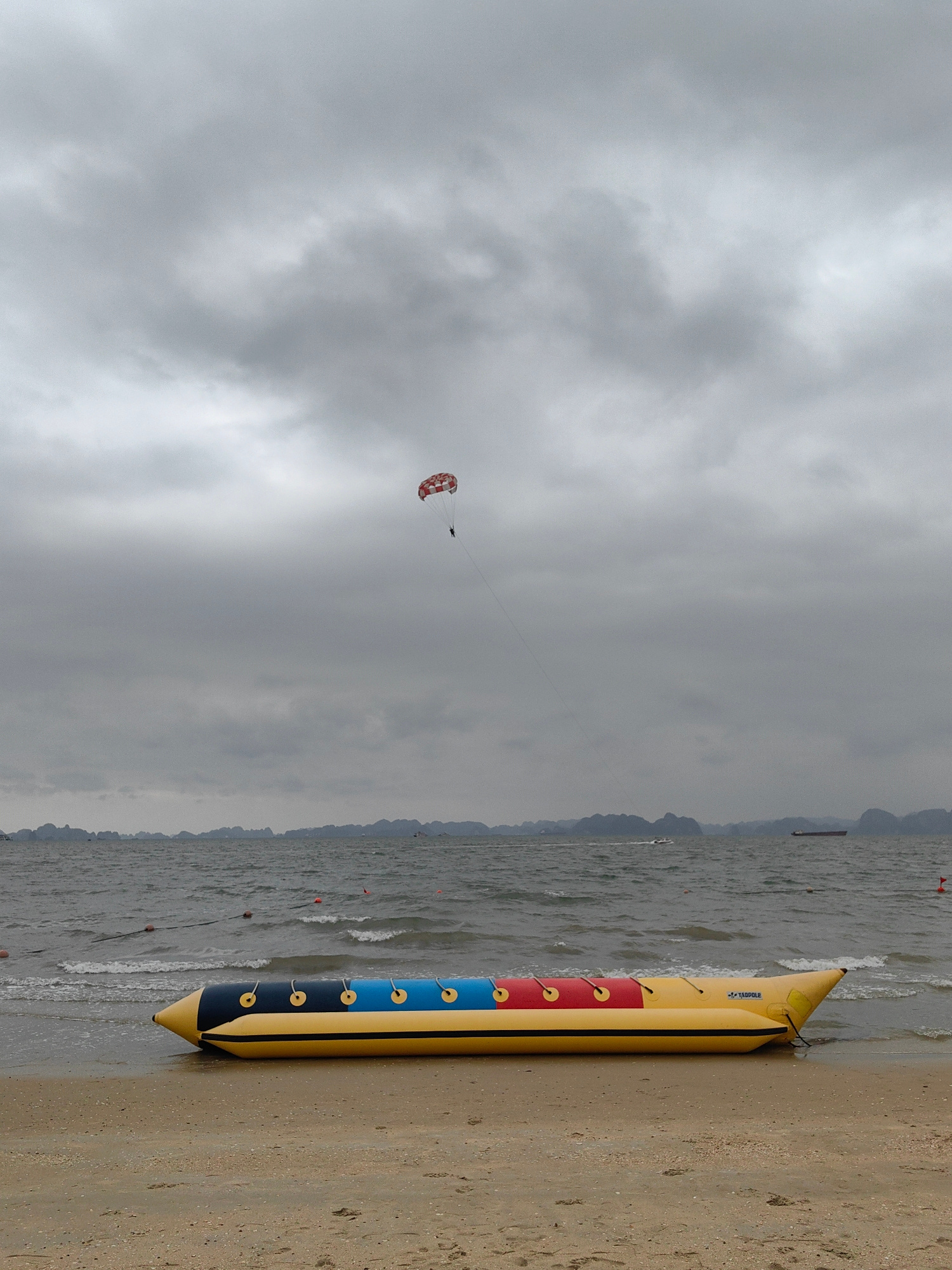 The image captures a beach scene in Bai Chay Ward, Vietnam on a cloudy day. A yellow inflatable banana boat sits on the sandy beach near the water's edge. In the distance, the ocean stretches towards…read more