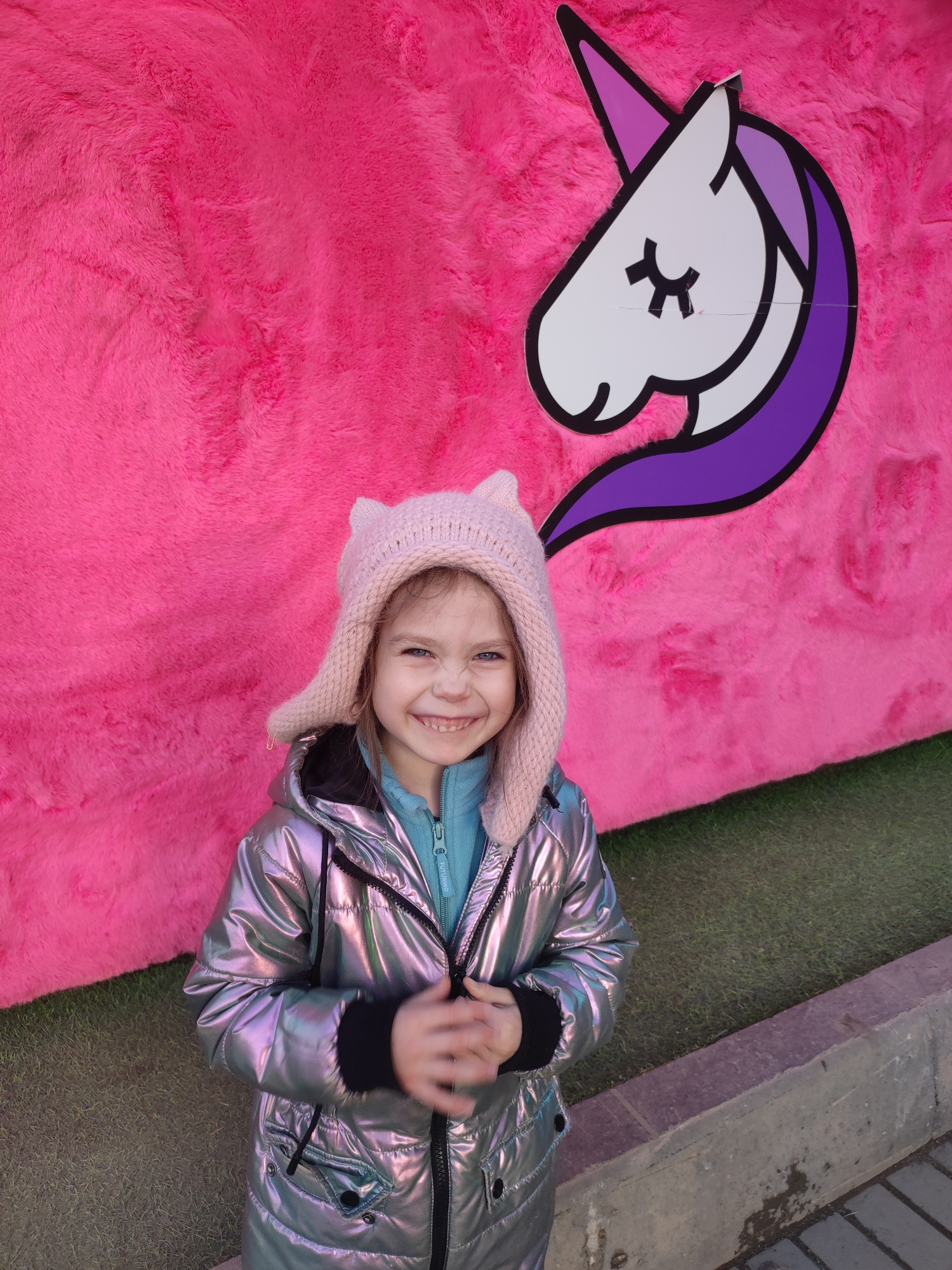 A young girl stands smiling in front of a bright pink display that features a unicorn head, likely in a public area within the city of Votkinsk, Russia. The girl wears a pink knitted hat with ear-likeβ¦read more