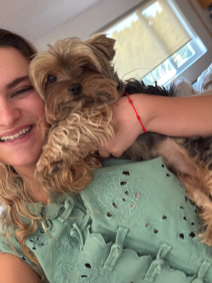 The image depicts a female individual, partially visible on the left, with light-colored wavy hair and a smiling expression, holding a Yorkshire Terrier dog. She is wearing a light green garment featu…read more