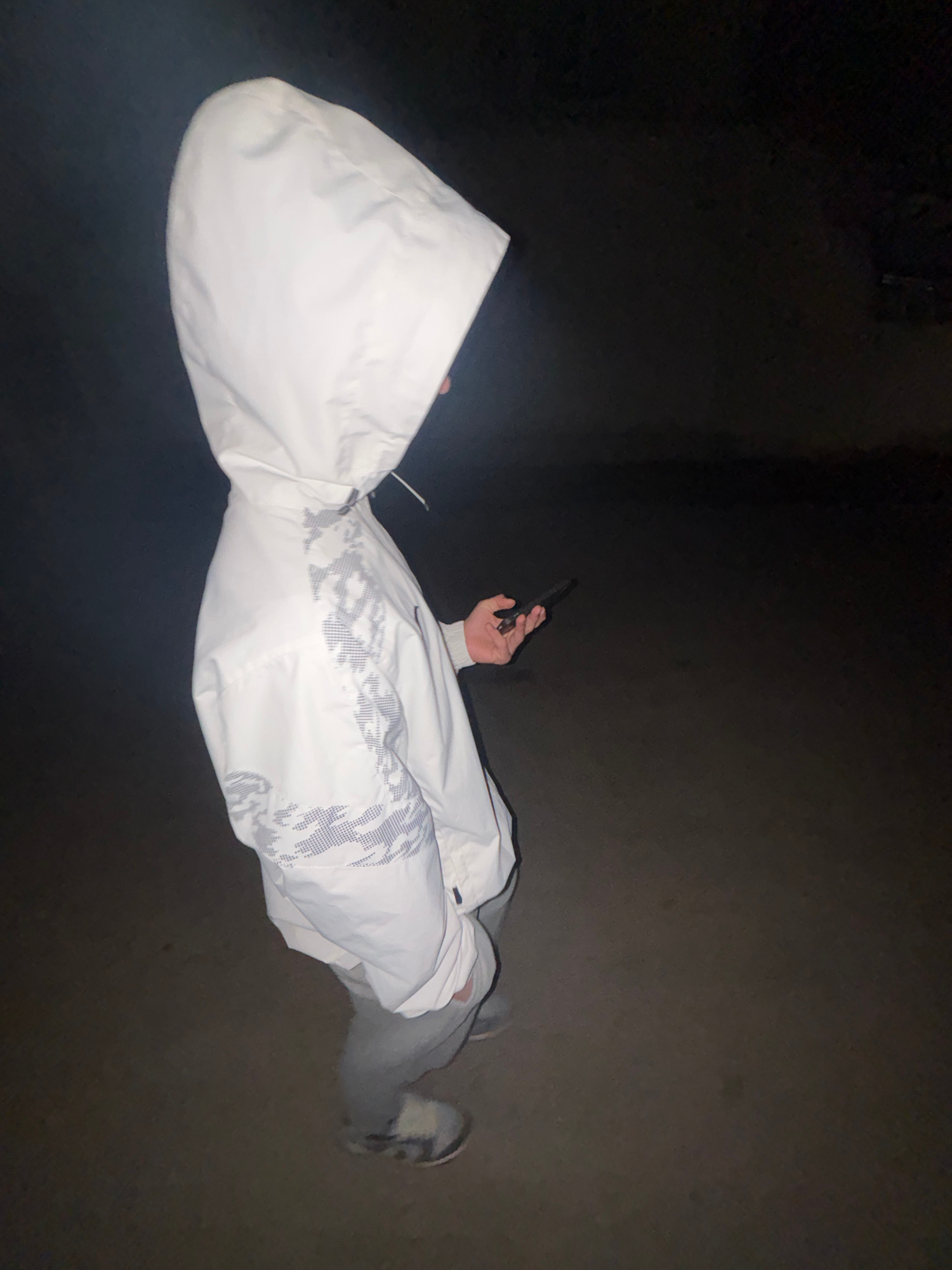 A person is standing in an unknown location. The person is wearing a white hooded jacket and light grey pants. They are holding a dark, rectangular object, possibly a phone, in their right hand. The e…read more