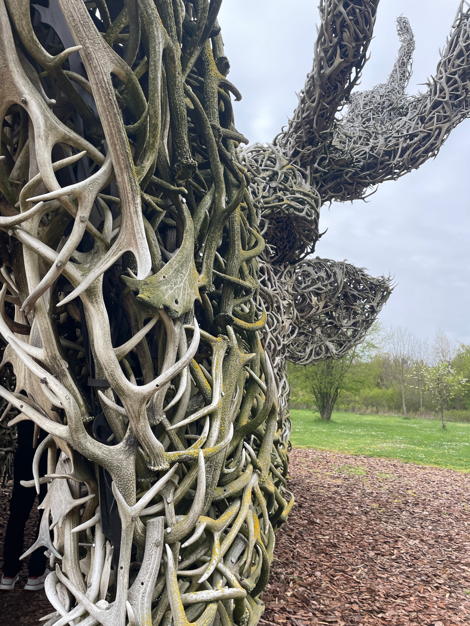 The image depicts a sculpture made of deer antlers. The sculpture, composed of a multitude of interwoven antlers, forms a larger structure. In the background is a grassy area and trees. The ground nea…read more