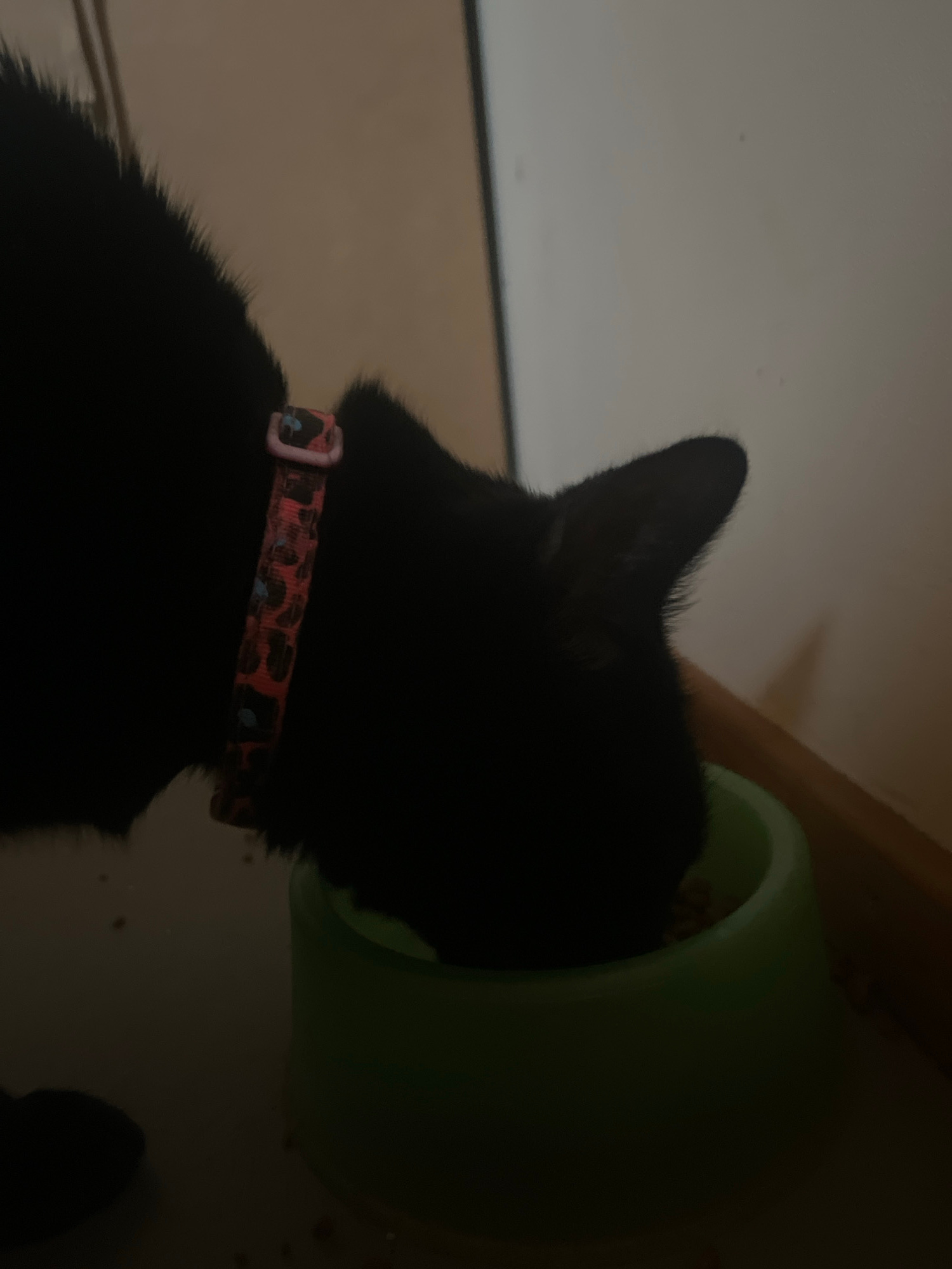 A black cat is eating from a green bowl. The cat has a pink collar with a leopard print design. The background appears to be a wall and a floor. There is no indication of the location being in Ushuaiaβ¦read more