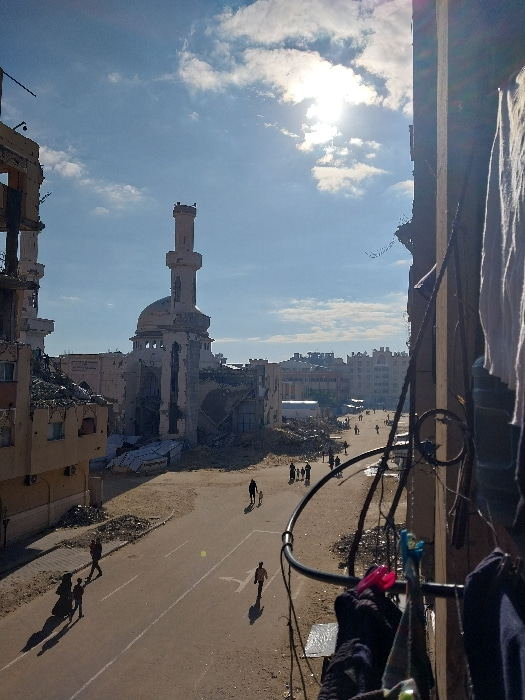 A damaged mosque with a tall minaret stands amidst the rubble of destroyed buildings under a bright sky. People walk along a street marred by destruction. The scene is observed from a high vantage poi…read more