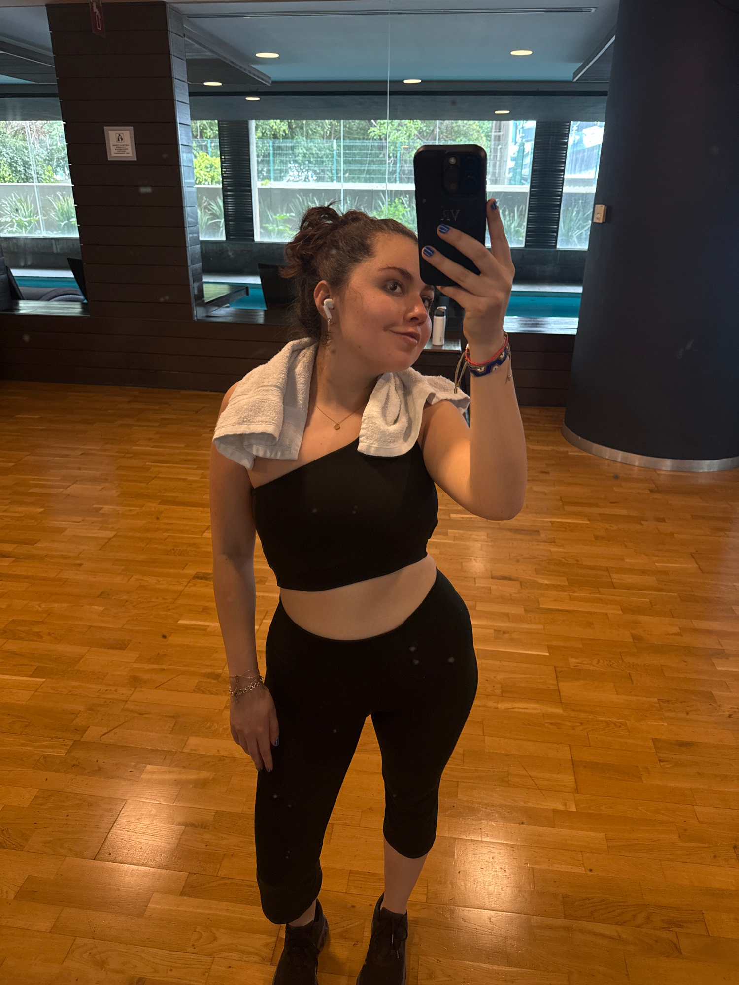 A woman with curly dark hair, wearing a black workout outfit, including a tank top and leggings, is taking a selfie in a gym. She holds a black smartphone with her left hand, showing blue nail polish.…read more