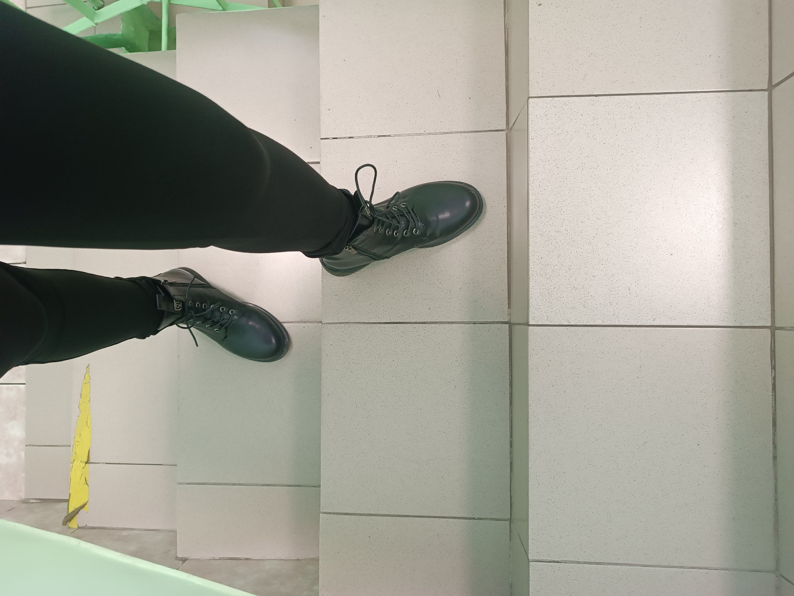 A top-down view shows a person standing on a set of stairs. The person is wearing black pants and a pair of laced, dark green ankle boots. The stairs are made of light gray tiles, and a yellow caution…read more