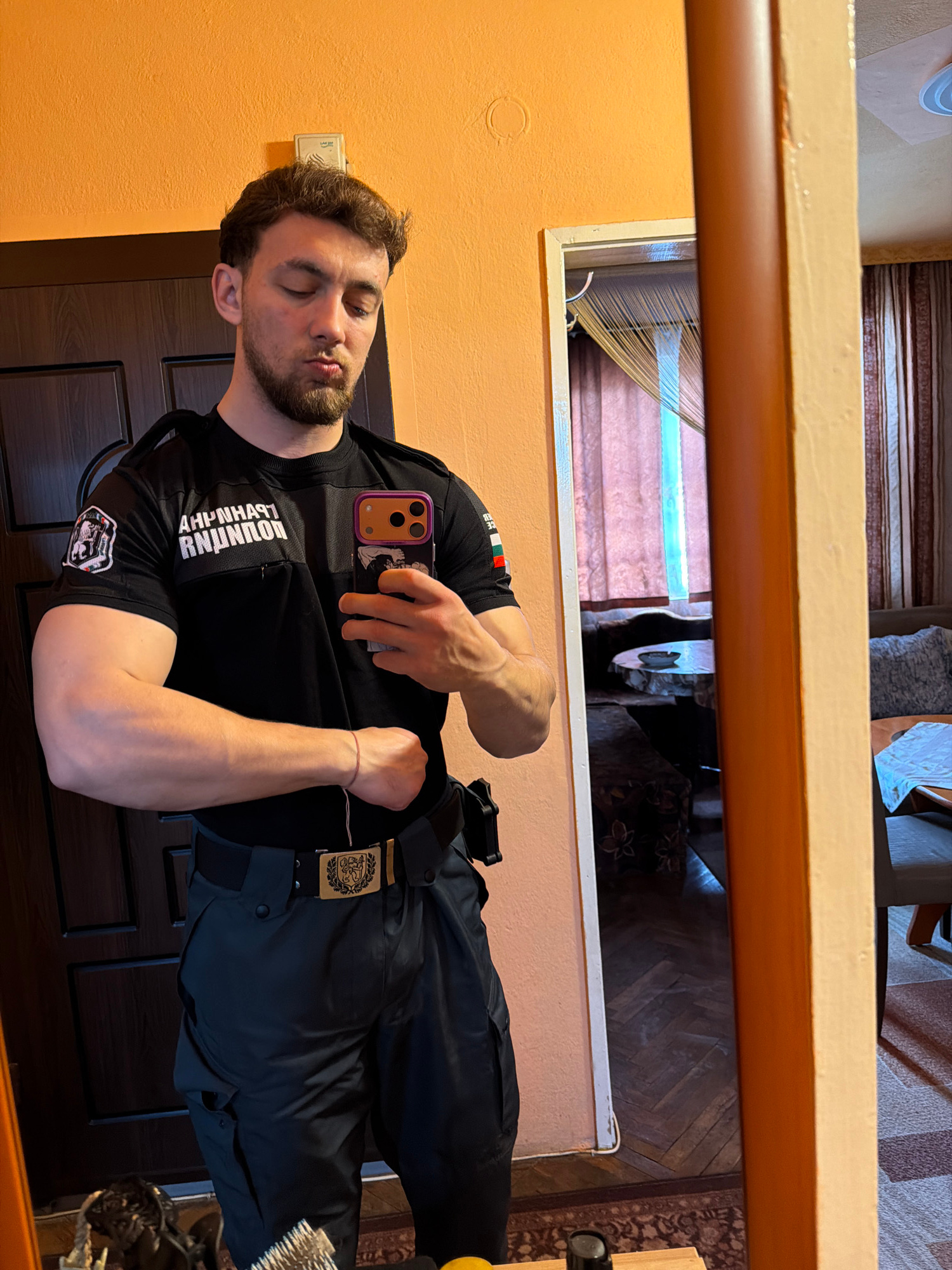The image is a mirror selfie taken by a young man indoors, likely in Tsarevo, Bulgaria. The man, with short dark hair and a beard, is depicted making a playful "duck face" expression with his eyes clo…read more