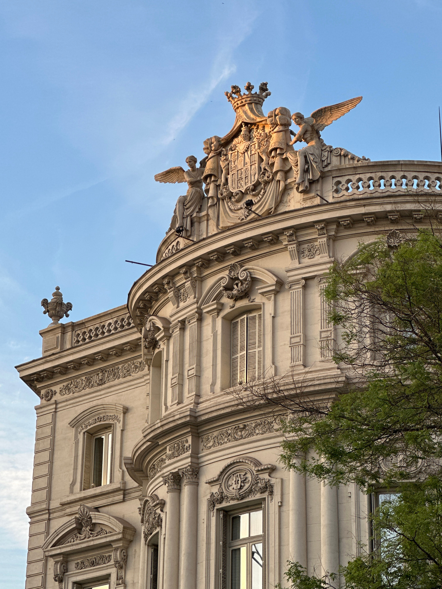 This image depicts the upper facade of a historical building in Madrid, Spain, viewed from a low angle, tilting upward towards the sky. The building is adorned with elaborate architectural details, inβ¦read more