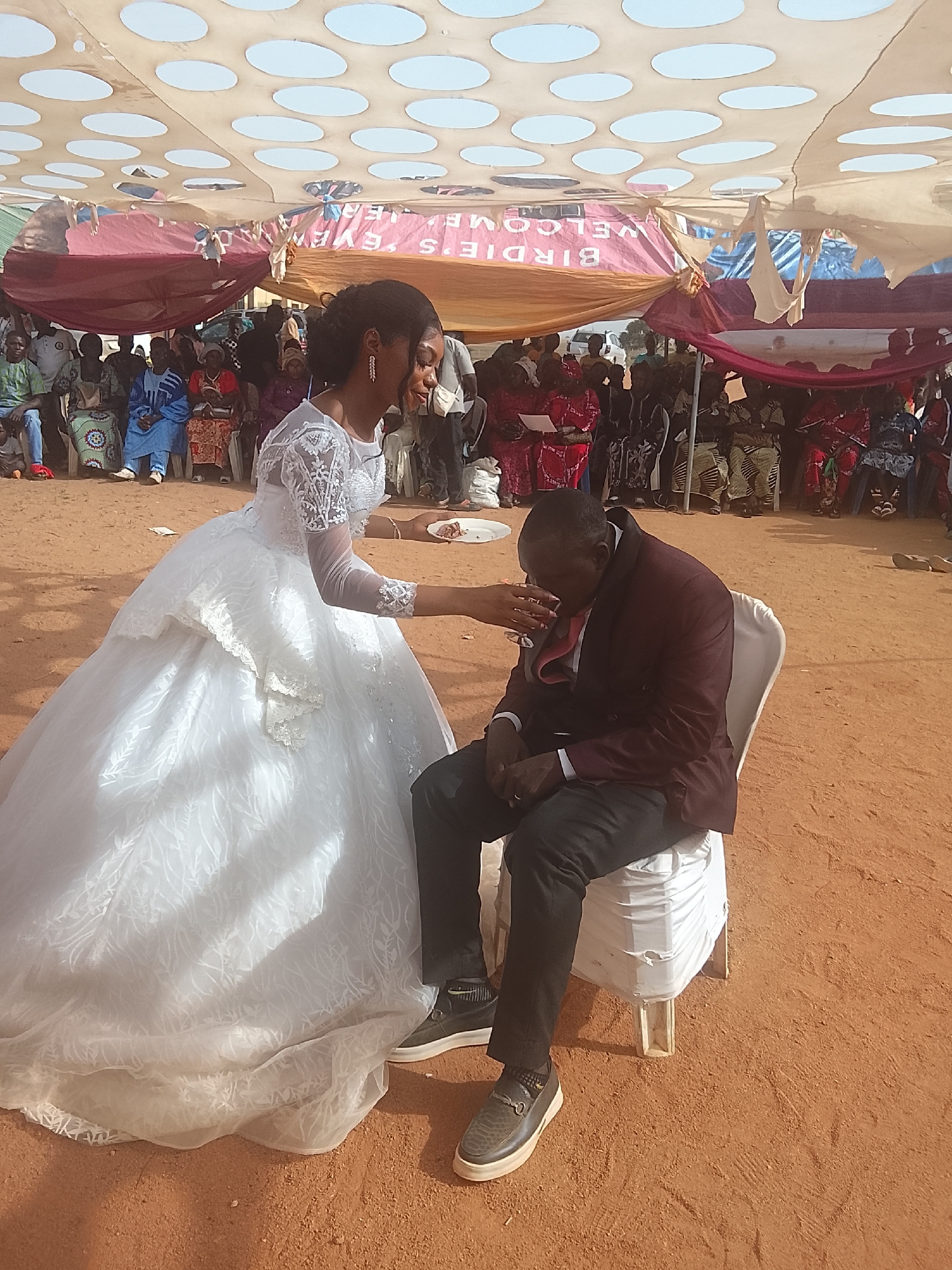 The image shows a wedding scene, likely in Dogon Dinia, Nigeria. A bride in a white gown offers a drink from a glass to a man sitting on a white plastic chair. The man is wearing a dark suit. Behind t…read more