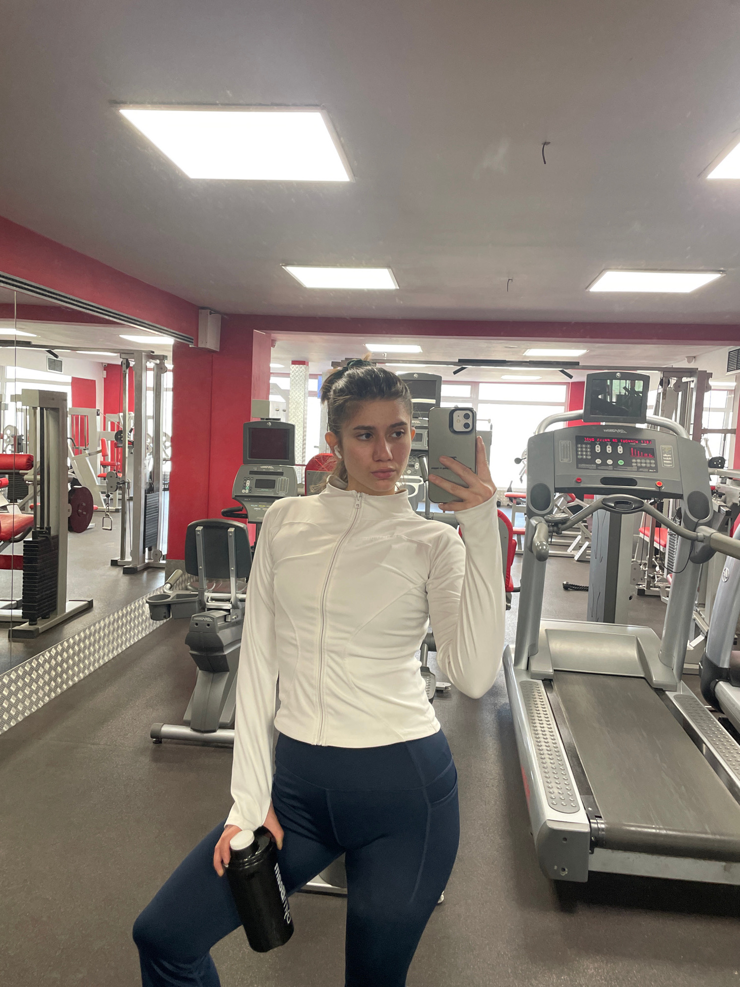The image is a selfie taken in a gym, likely located in Sofia, Bulgaria, given the red and white color scheme common in Bulgarian athletic facilities. The subject is a young woman wearing a white long…read more
