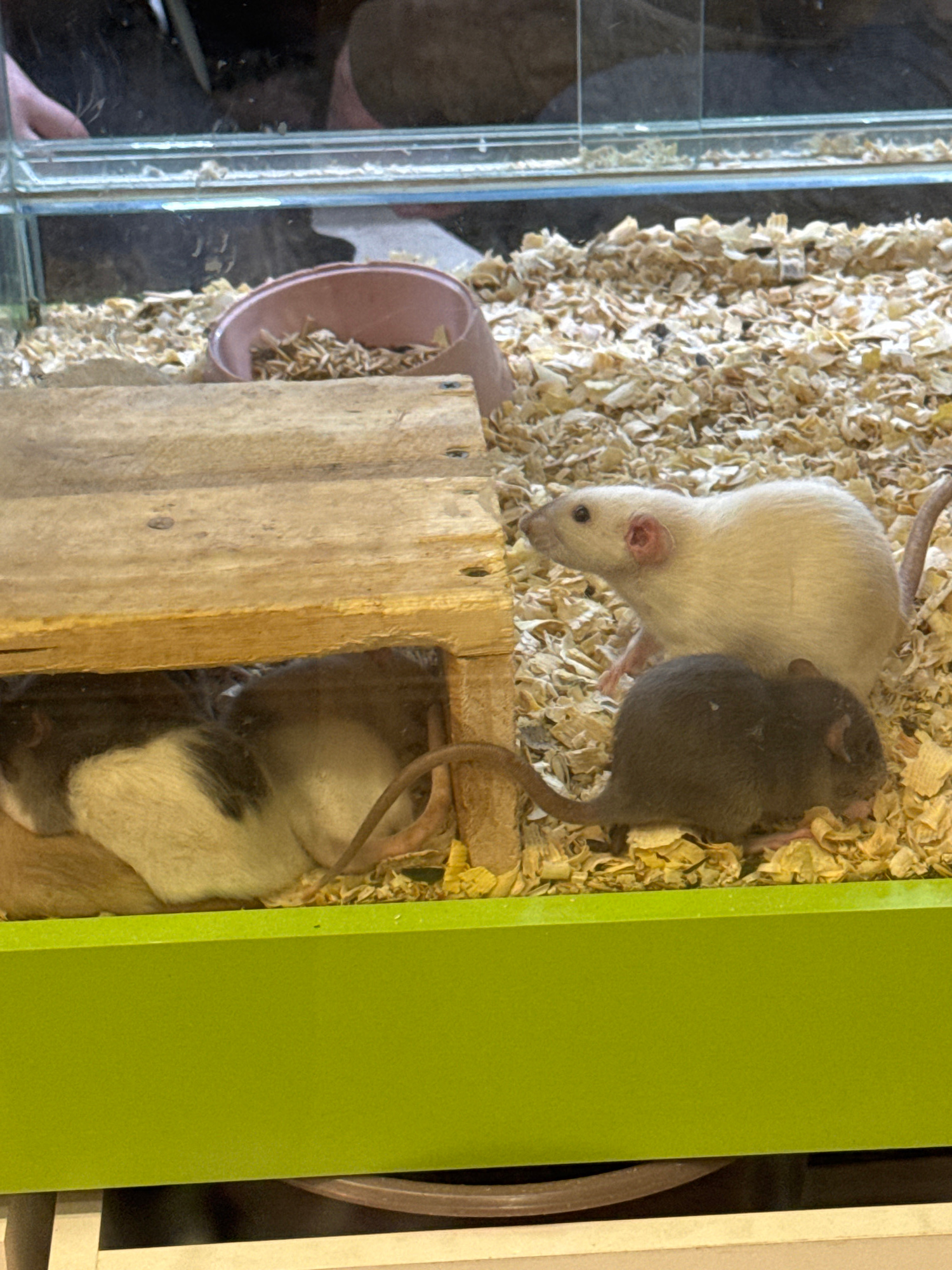 The image shows a pet enclosure, likely a cage or terrarium, containing several rats. Two rats are visible near the top, one white and one dark gray, standing on wood shavings and near a wooden struct…read more