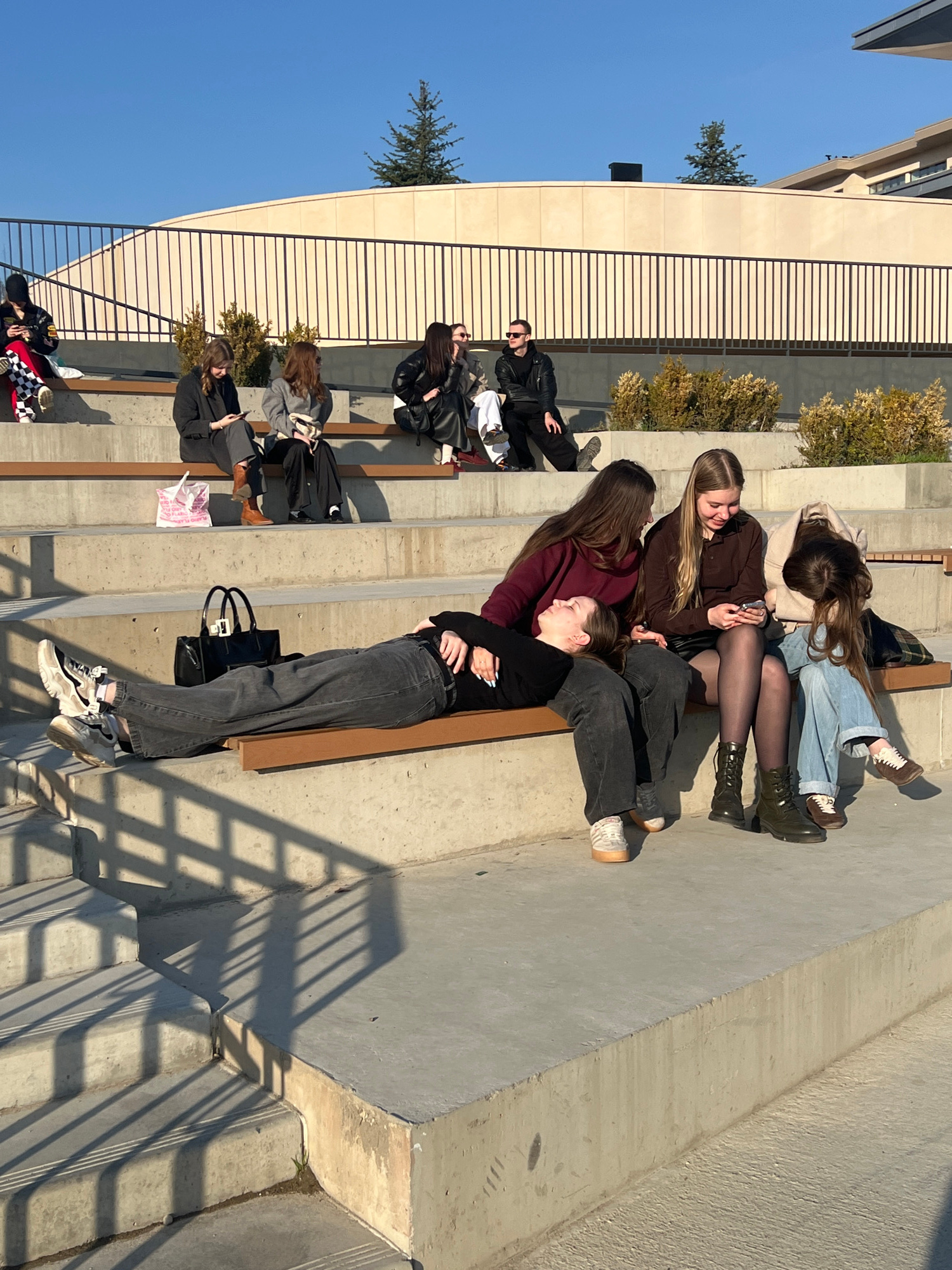 The image shows a group of people sitting on concrete steps in an outdoor urban setting. Some appear to be teenagers or young adults. Several of them are casually lounging on the steps, while others a…read more