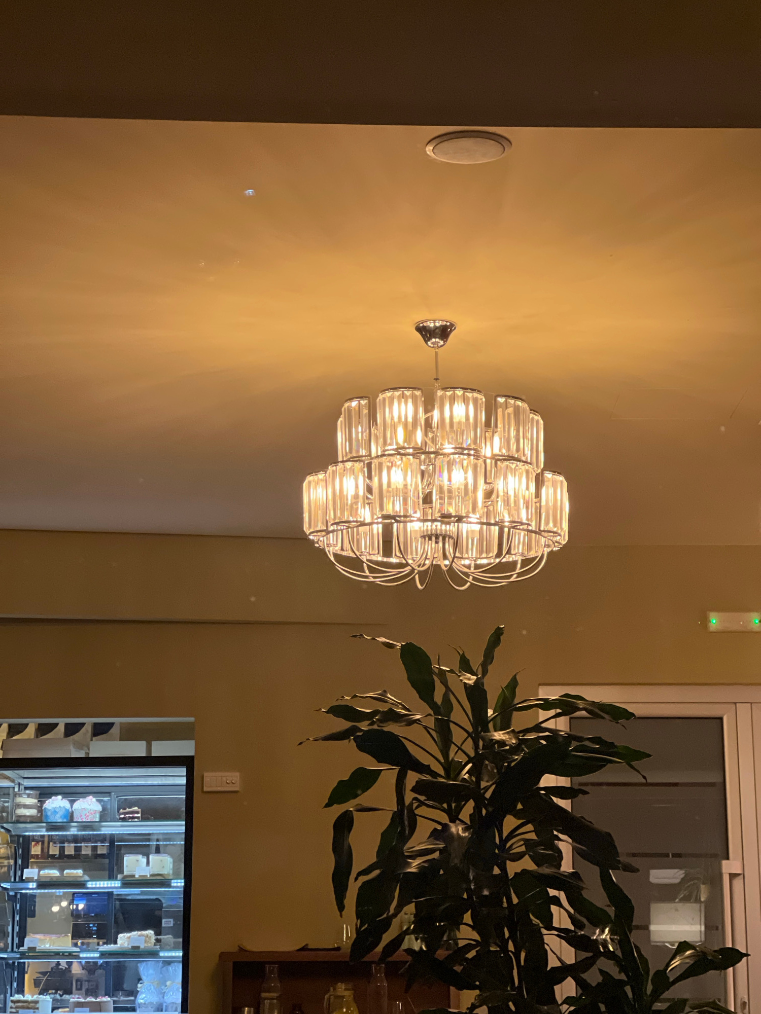 The image shows an indoor scene with a lit chandelier hanging on a beige wall. To the right of the chandelier, there is a window and part of a plant. Below the window is a display case. A circular obj…read more