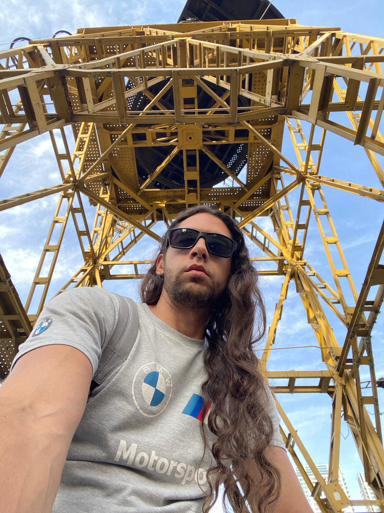 A man with long brown hair and sunglasses is taking a selfie. He is wearing a gray BMW Motorsport shirt. Behind him is a large yellow metal structure against a blue sky with some clouds. The structureβ¦read more