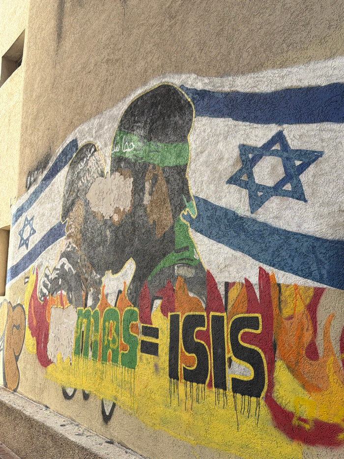 A mural is displayed on a light beige, textured stucco wall in Tel-Aviv, Israel. The central element of the mural is a large depiction of the Israeli flag, featuring two horizontal blue stripes on a w…read more