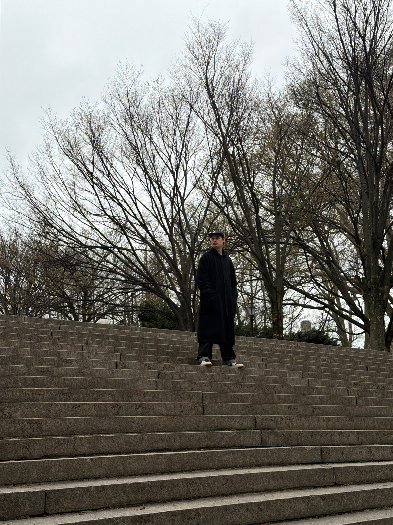 A medium eye-level shot depicts a figure on a staircase alongside bare branches of trees against a cloudy sky. The figure, centered in the frame, stands on the stairs wearing a long black coat, dark…read more