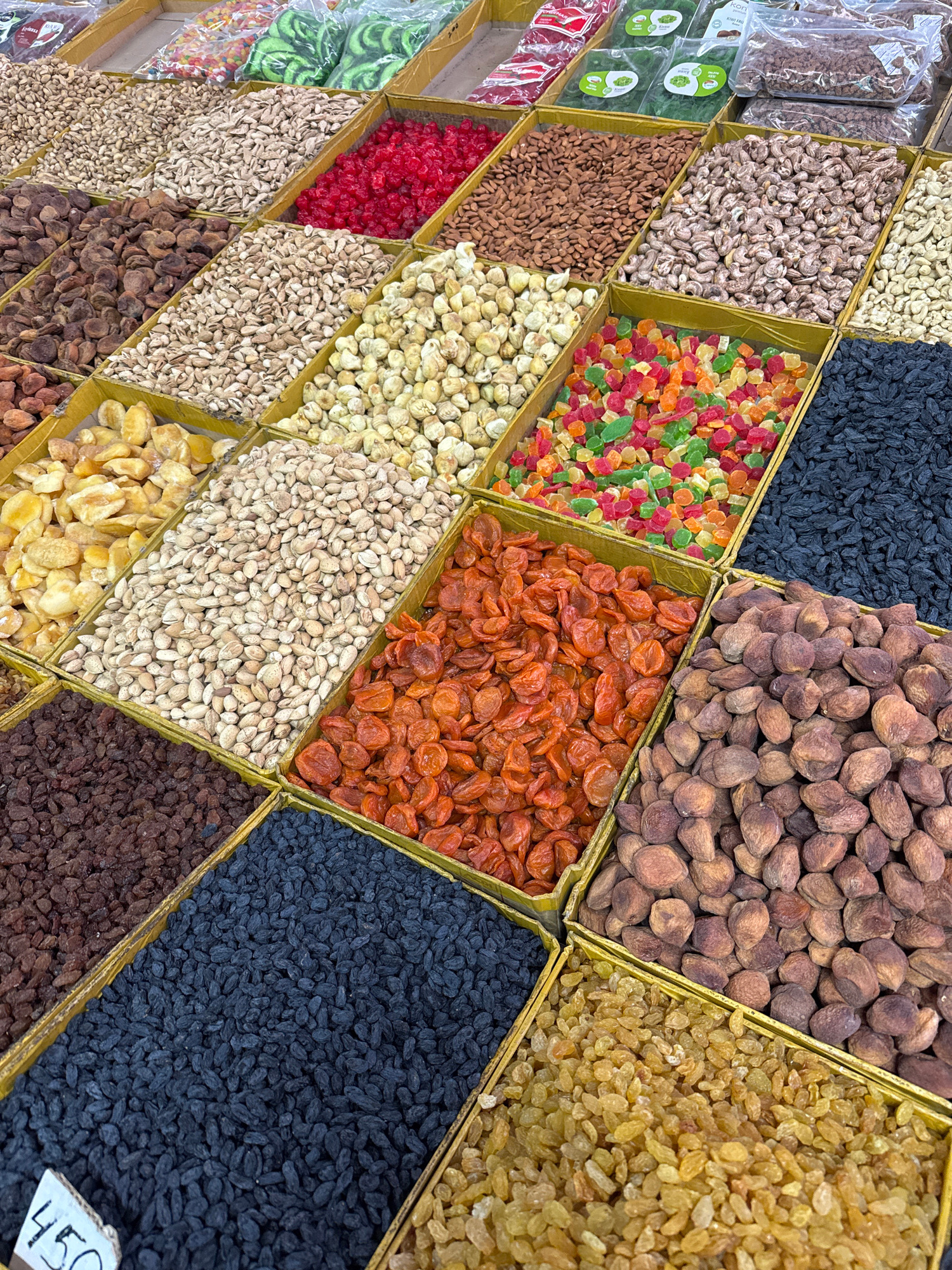 A vibrant display of dried fruits, nuts, and candies is presented for sale in a market stall, likely in Bishkek City, Kyrgyzstan. The items are neatly arranged in numerous rectangular and square bins,…read more