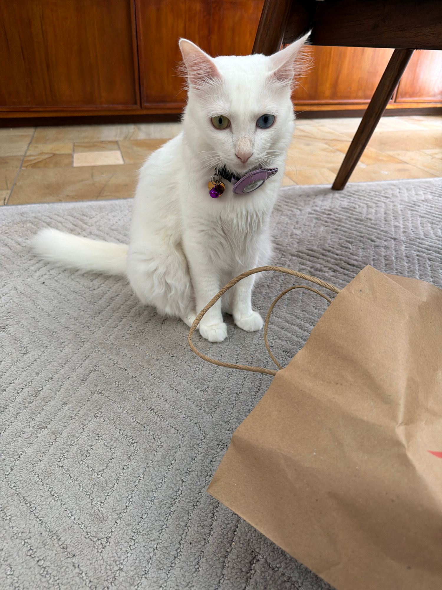 A white cat with heterochromia (one blue eye, one green eye) sits beside a brown paper bag on a gray patterned rug indoors. The cat wears a purple collar with a tag and a dangling purple charm. Part o…read more