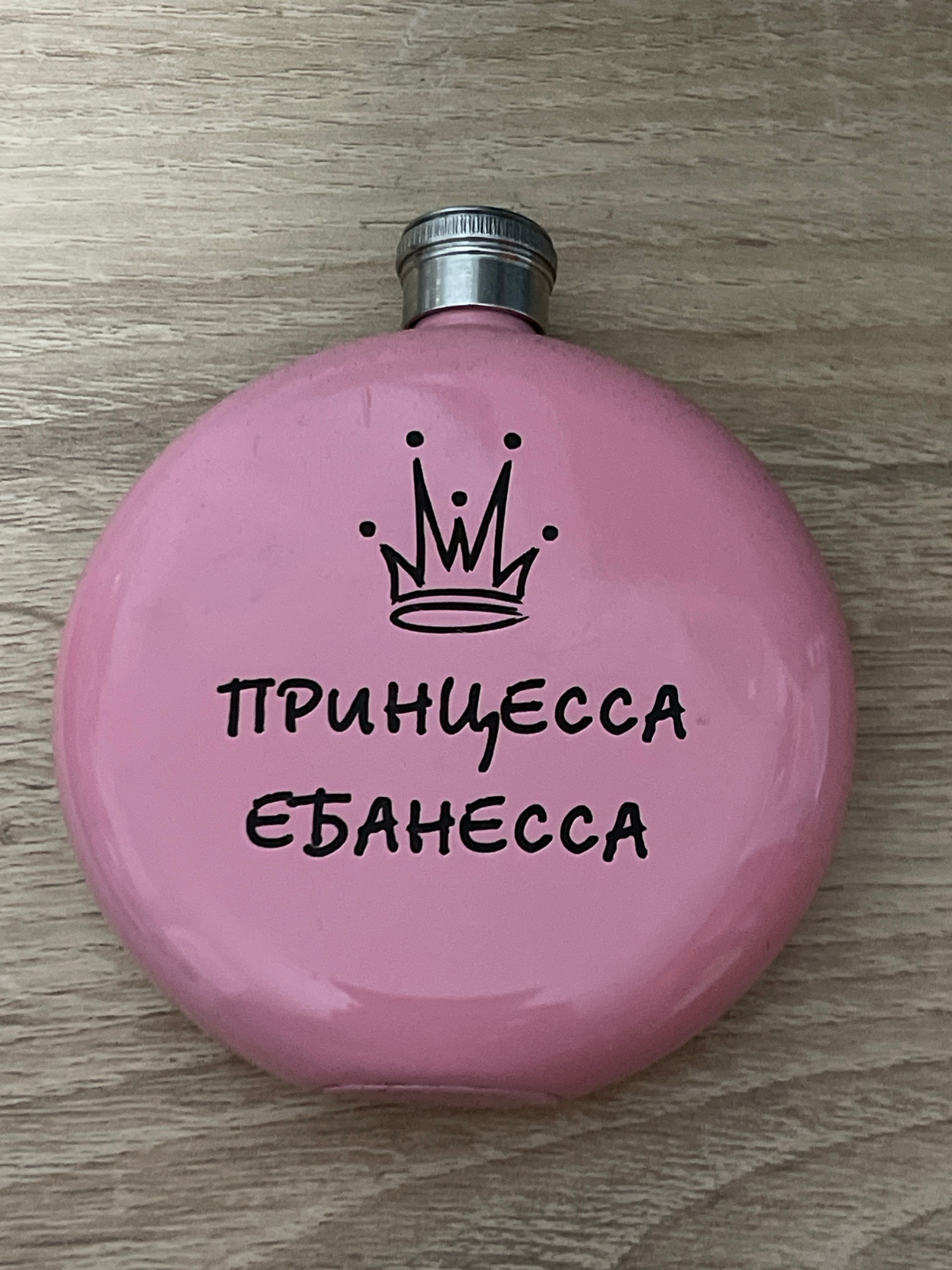 A pink, round hip flask with a silver metal cap sits on a light-colored wooden surface. Printed on the flask in black ink is a crown design and the Russian words "ПРИНЦЕССА ЕБАНЕССА" (PRINCESS EBANESS…read more
