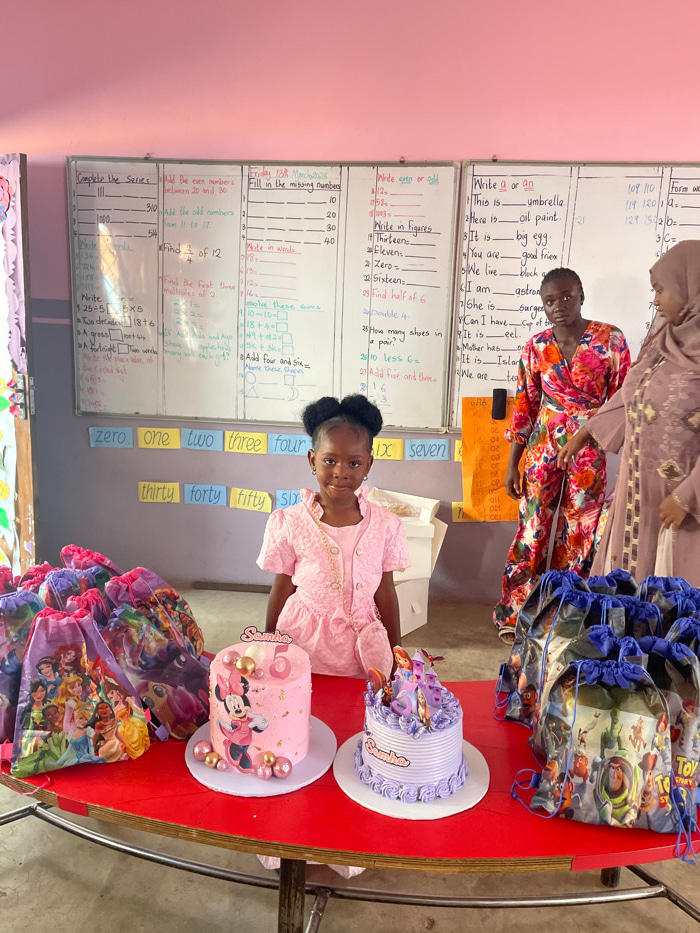 The image captures an indoor classroom scene in Jos, Nigeria, arranged for a birthday celebration. A young Black girl, approximately five years old, stands centrally in the foreground, directly facingβ¦read more