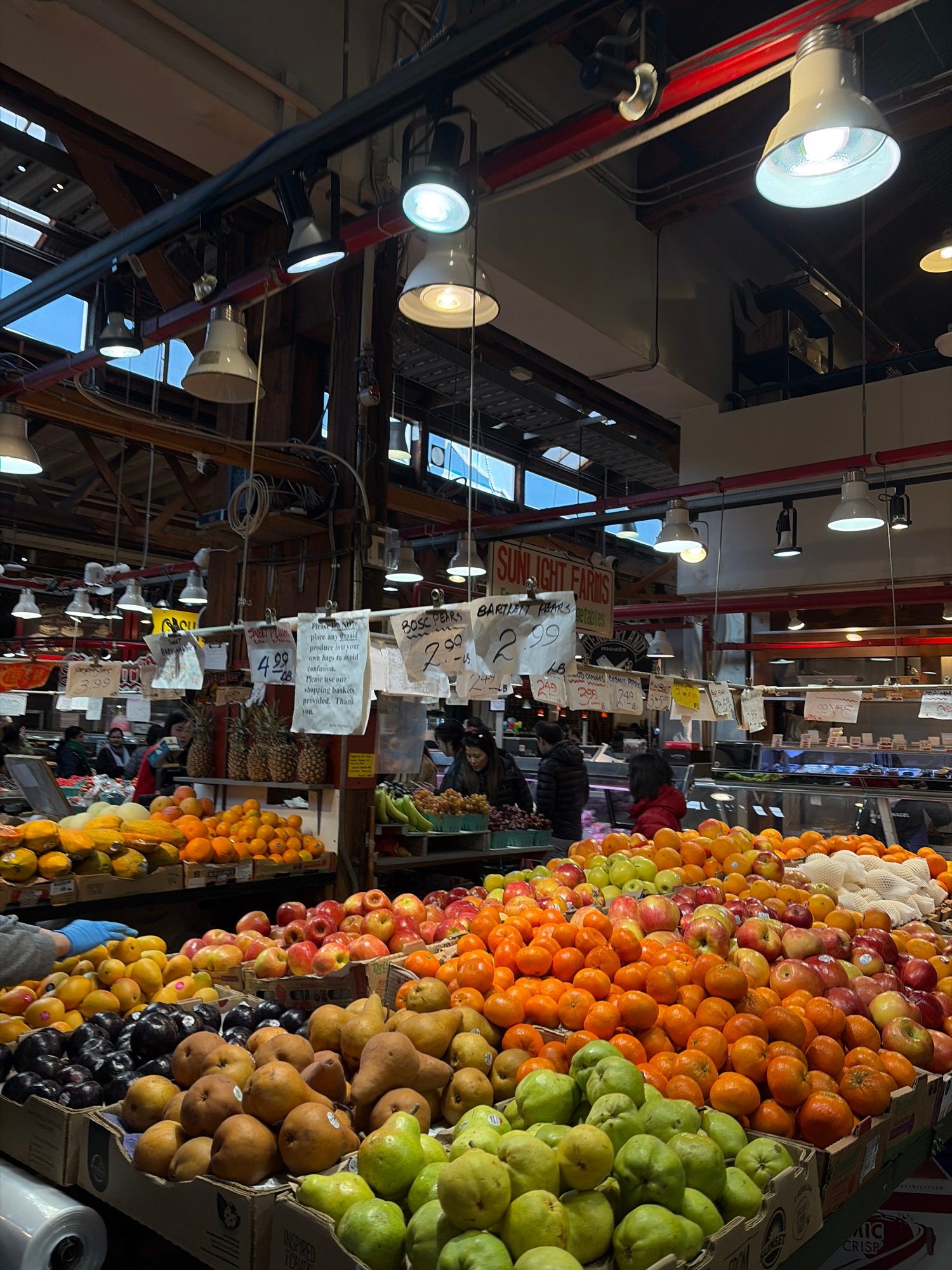 The image captures a fruit stand inside the Granville Island Public Market in Vancouver, Canada. Stacks of fruit, including oranges, apples, pears, plums, and other varieties, are densely arranged in…read more