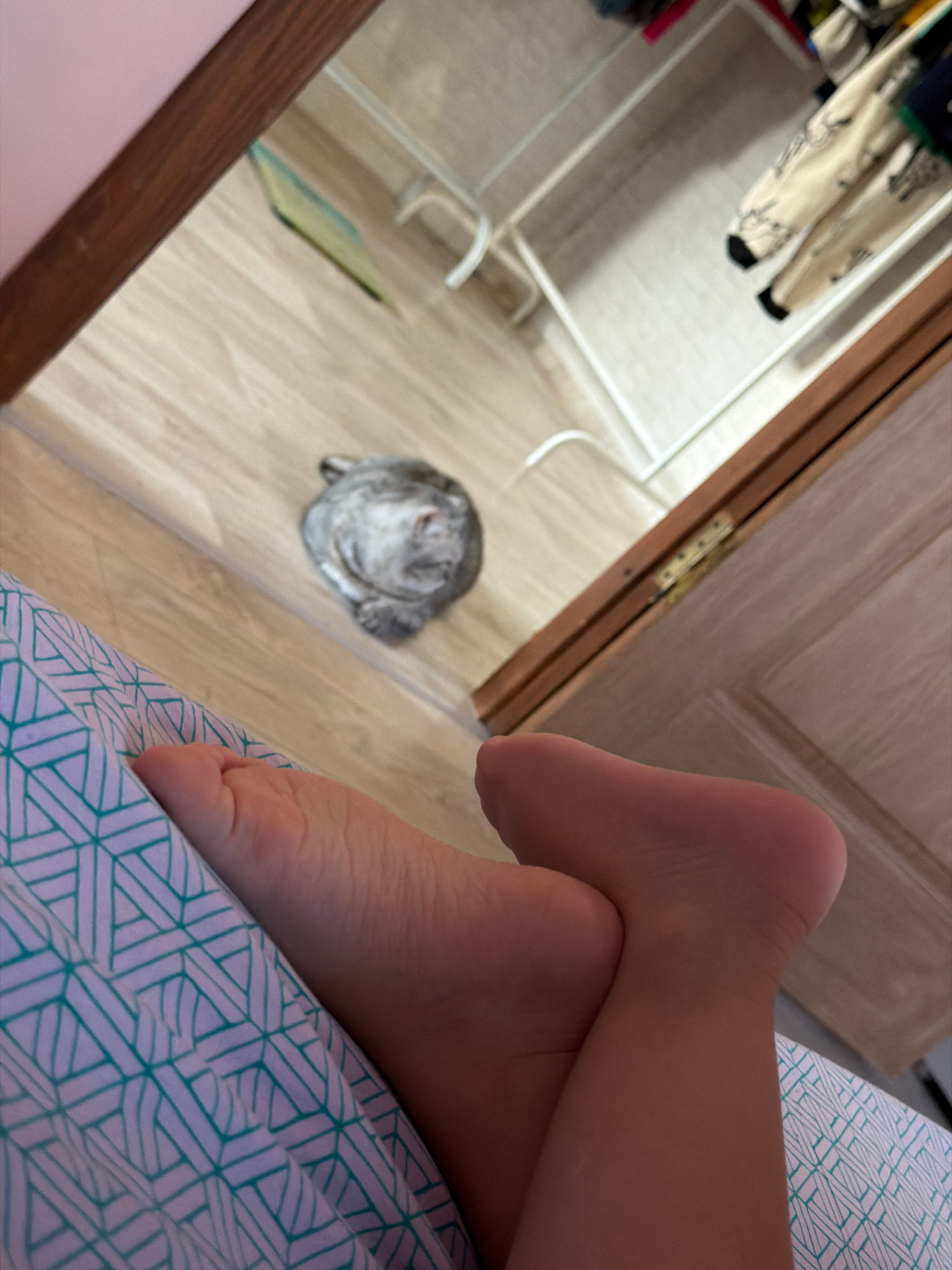 The image depicts an indoor scene, likely a bedroom in Chaikovsky, Russia, viewed from a first-person perspective. In the foreground, the bare feet and lower legs of a person are visible, resting comf…read more