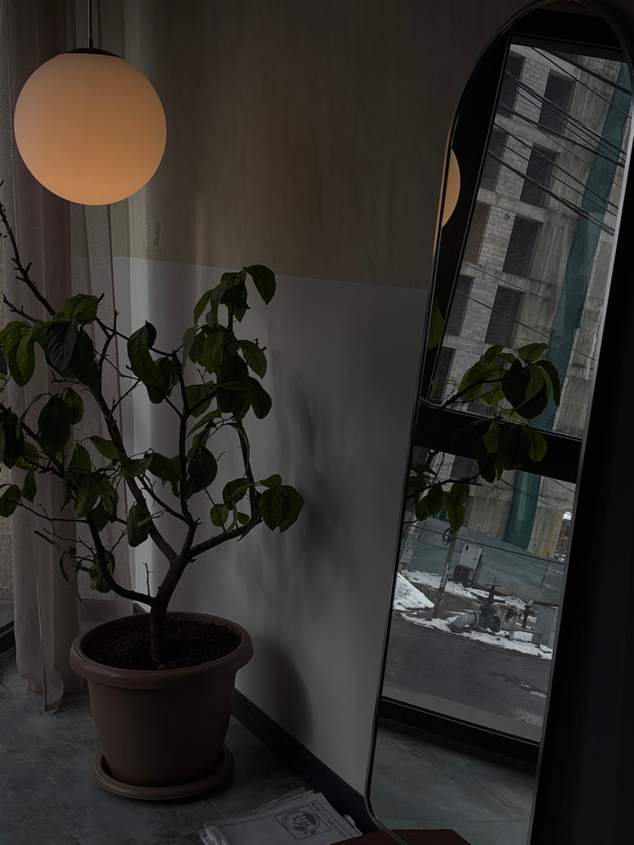 The image presents an indoor scene within the city of Zovuni, Armenia, featuring a potted plant and a mirror reflecting an outdoor urban environment. In the upper left quadrant, a large, spherical whi…read more