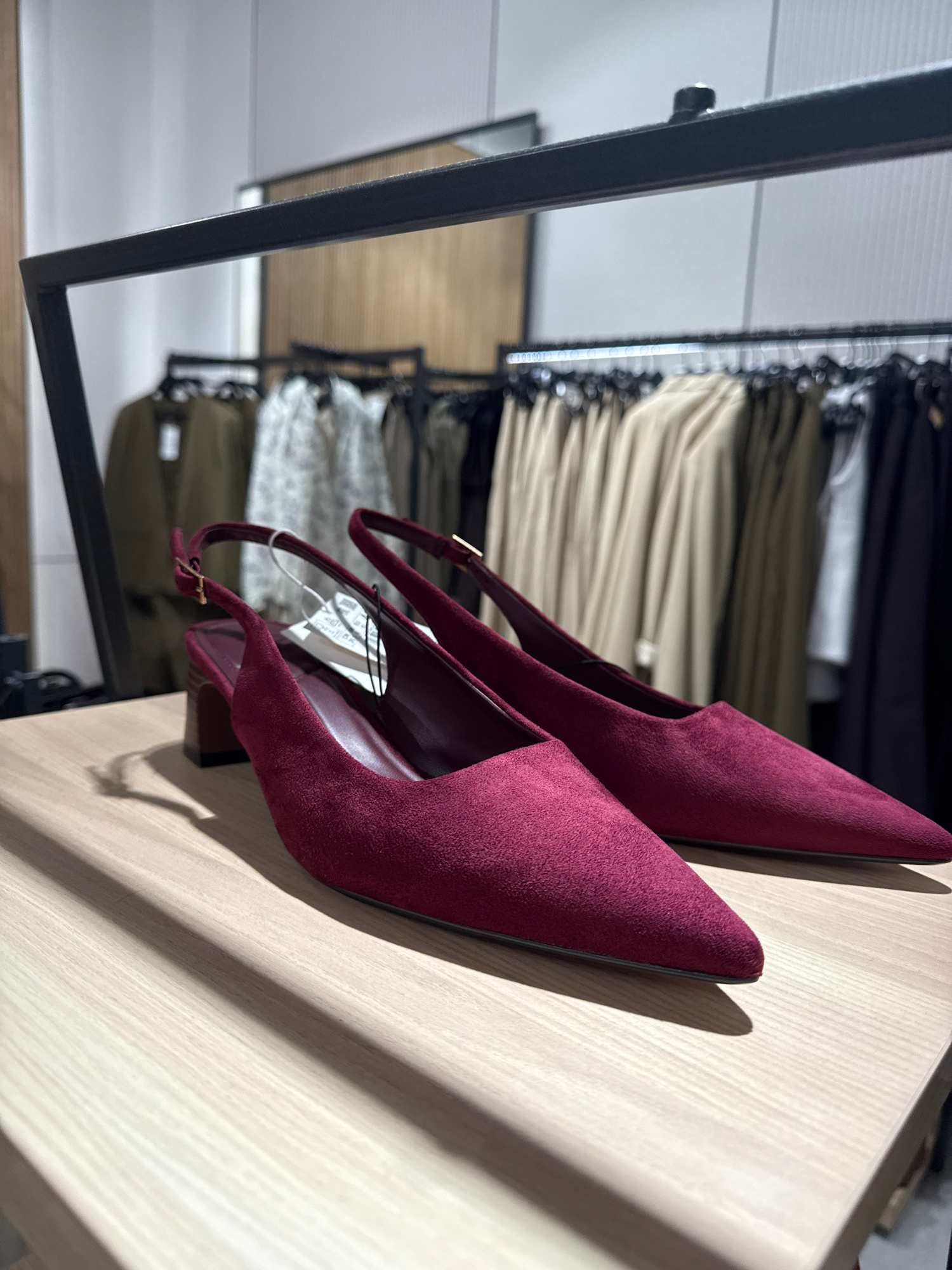 This image captures a pair of deep maroon or burgundy suede slingback high heels, prominently displayed on a light-colored wooden surface, likely a shelf or table within a retail environment. The shoe…read more