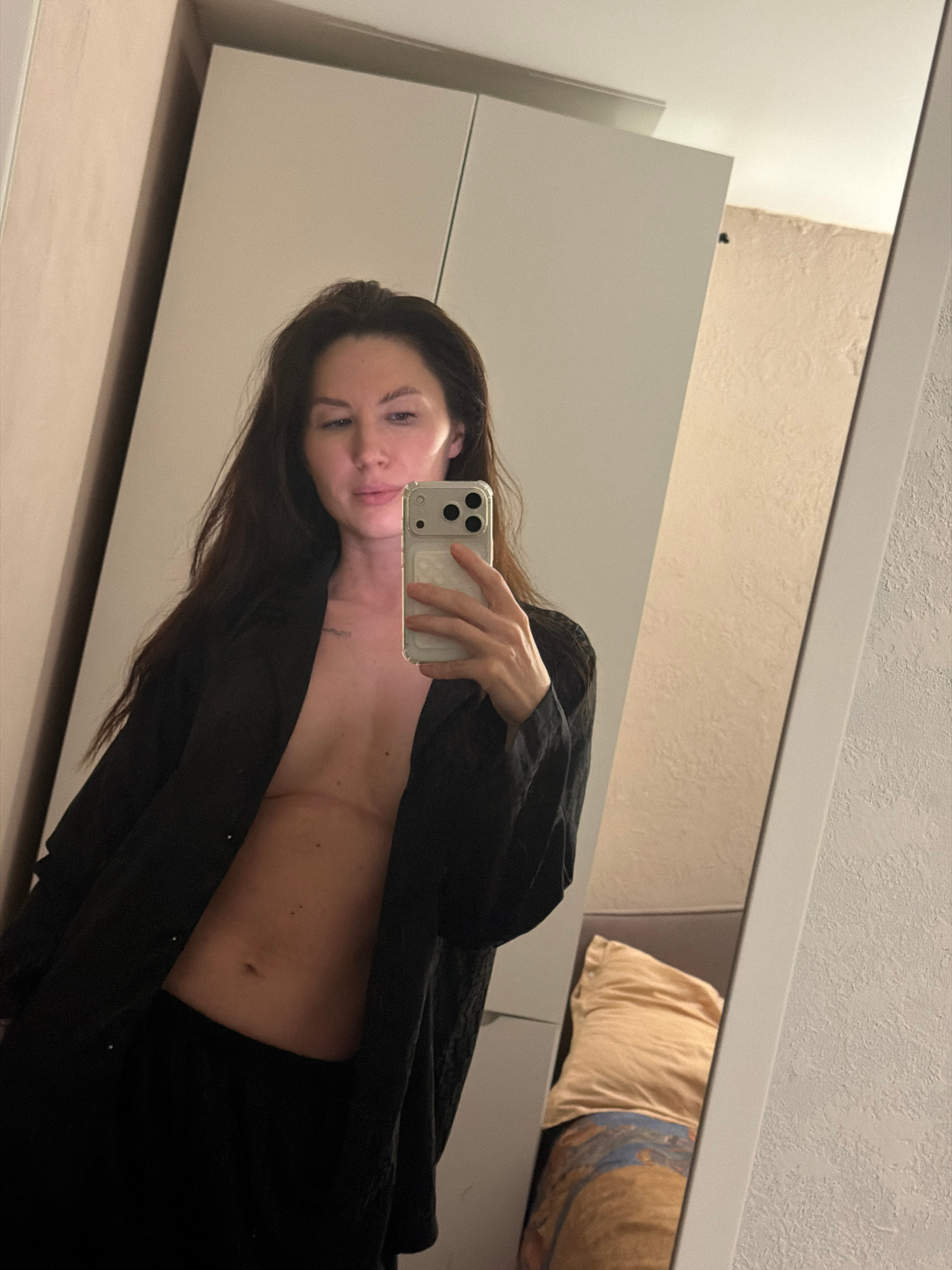 A mirror selfie taken indoors. The person is holding a phone in their right hand and angling it towards a mirror. The person has long, dark hair and is wearing a black outfit open at the chest. Visibl…read more