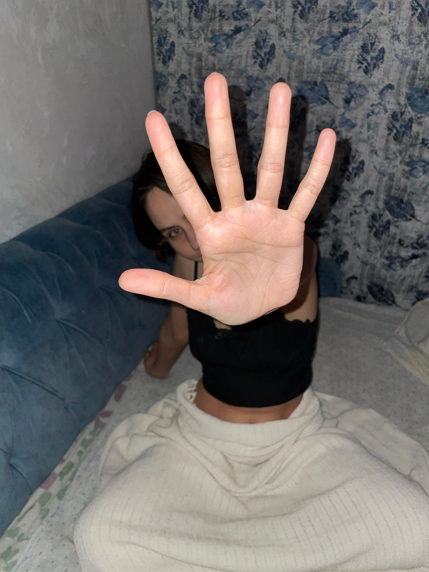 A person is lying on a bed. The person is wearing a black top and a white blanket or robe. The person has brown hair and is looking at the camera. Their right hand is outstretched towards the camera.…read more