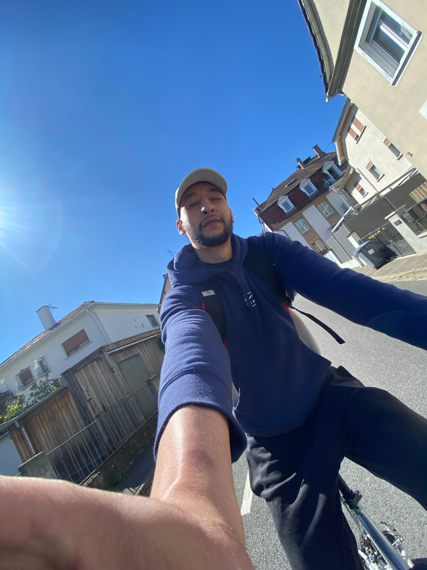 A person is on a bicycle on a street in Hoenheim, France. The person wears a blue hoodie, dark pants, and a light-colored baseball cap. Buildings and a clear blue sky are visible in the background.