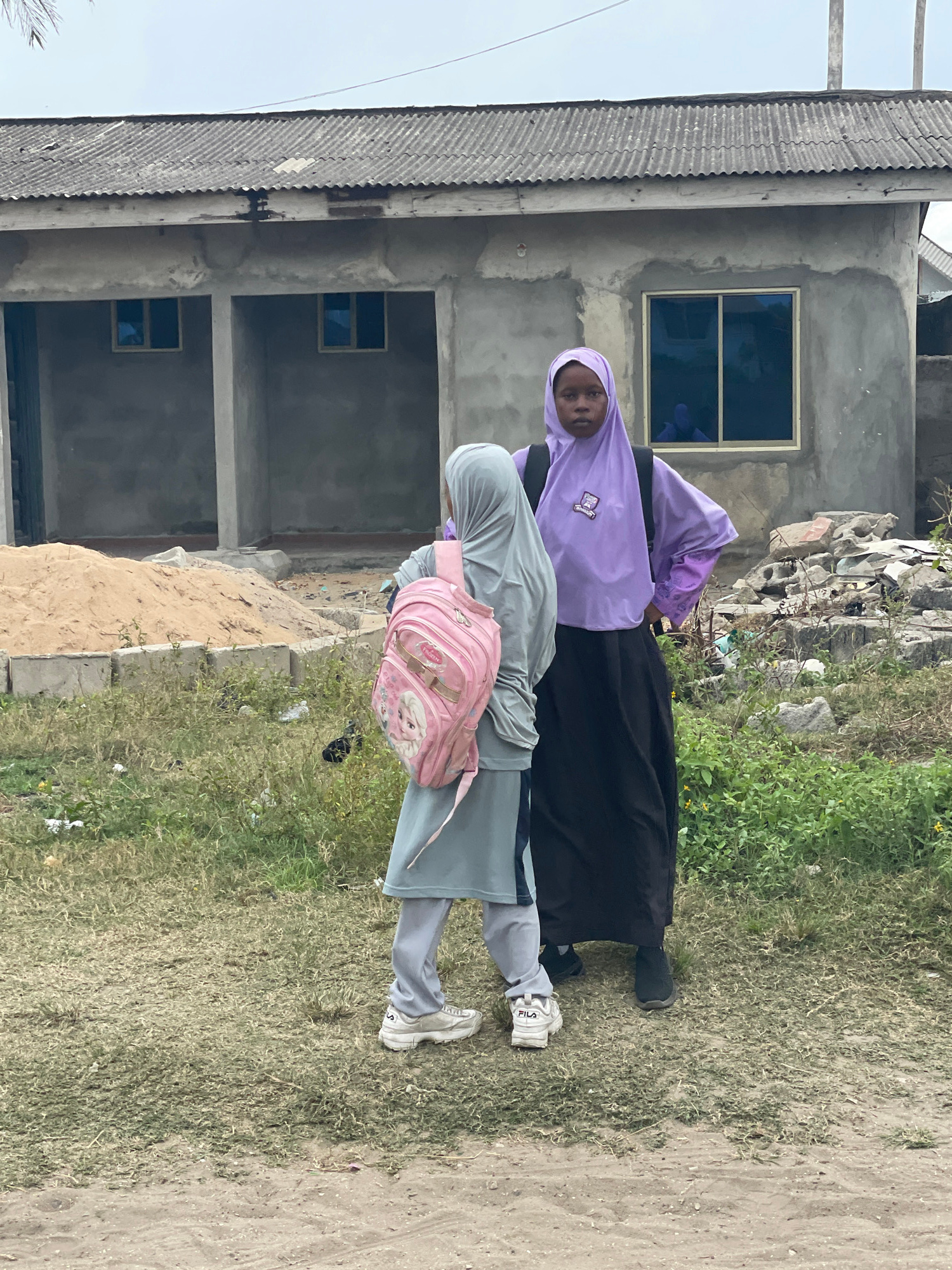 Two young girls stand next to a two-story concrete building with blue-tinted windows. The first girl, closer to the building, wears a purple hijab and long black dress. The second girl, wearing a grey…read more