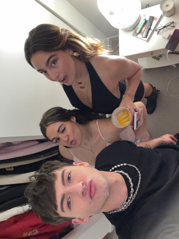 A photo shows three people posing closely together. A woman with brown hair and a black top is on the left. In the center, a woman with brown hair and a light pink top winks while holding a drink andβ¦read more