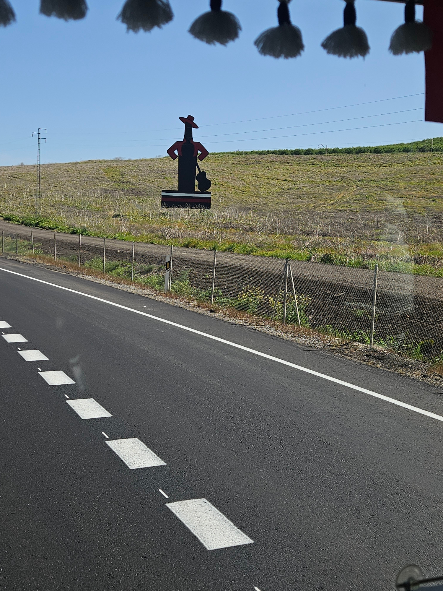 The image shows a road in Los Palacios y Villafranca, Spain. The road is paved with black asphalt and has white dashed lines marking the lanes. A solid white line separates the lane from the shoulder.…read more